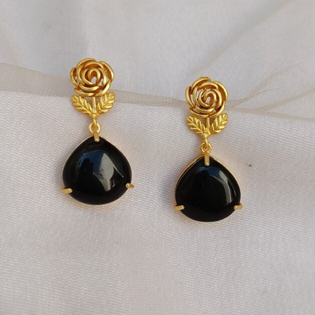 Gold Plated Rose Black Stone Drop Earrings