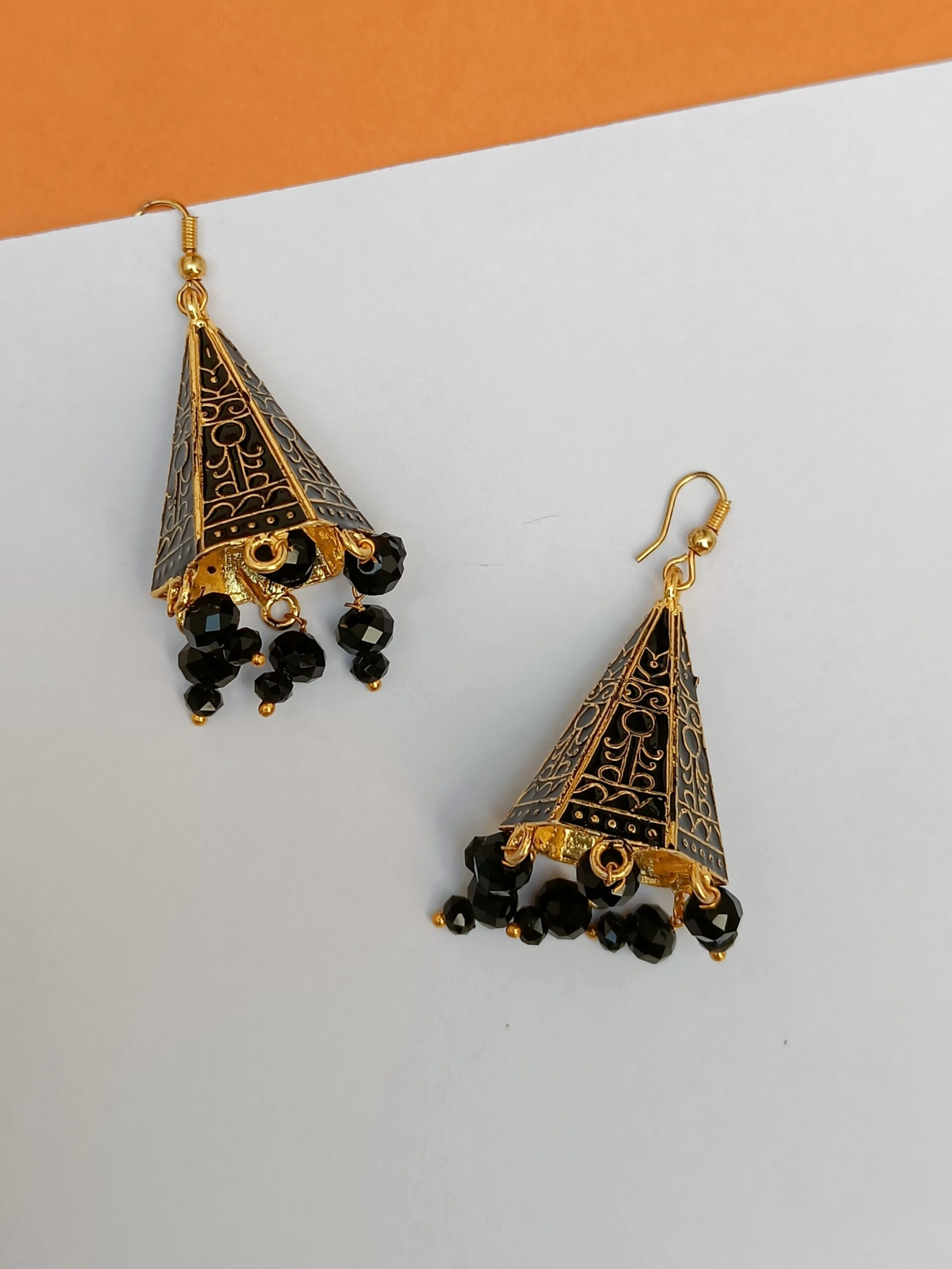 Elevate your look with Black Cone Hook Earrings. These are elegant and captivating statement pieces that will enhance your beauty.