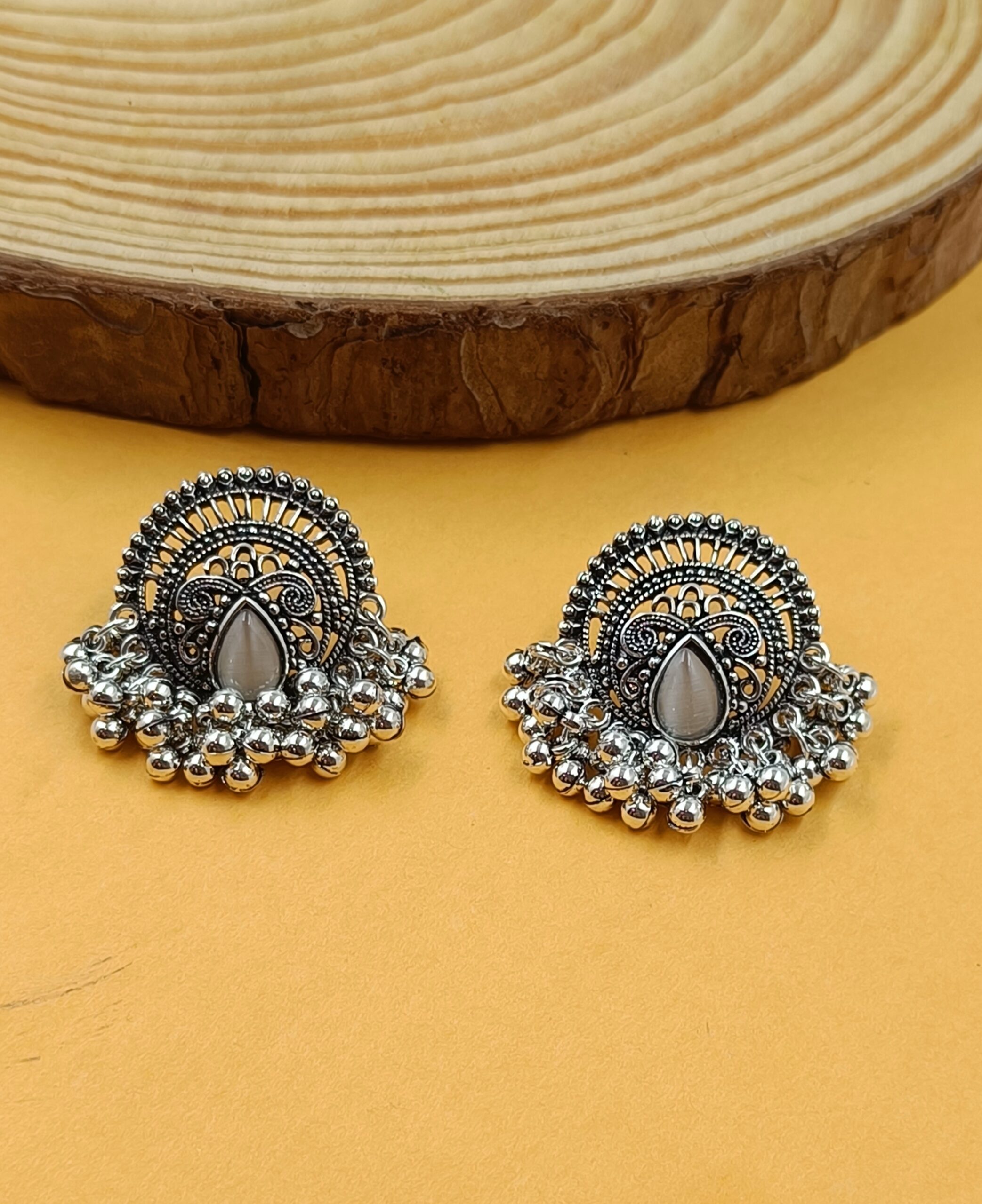 Elevate your look with FHF Designer oxidised Grey Stone Stud Earrings. These are elegant and captivating statement pieces that will enhance your beauty.