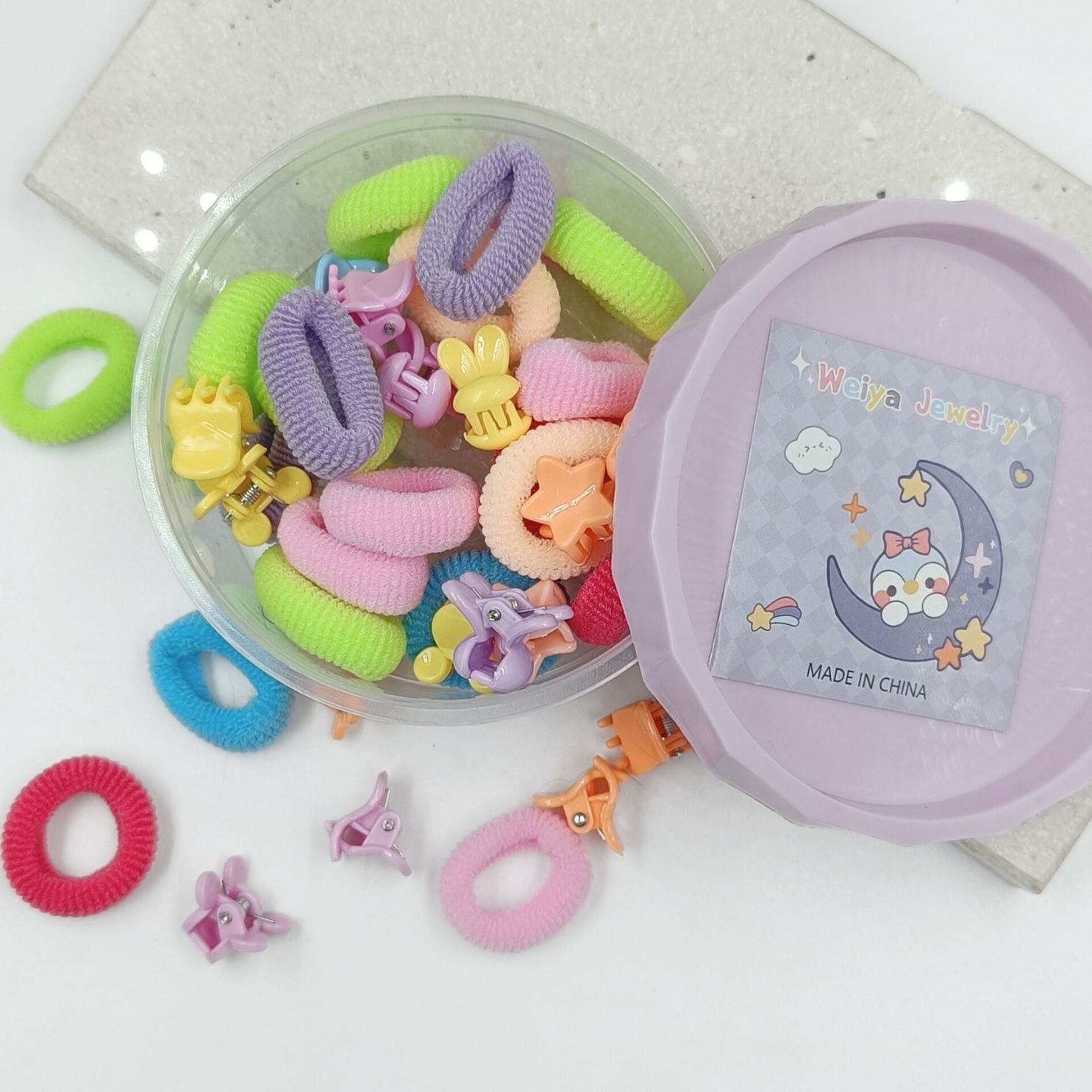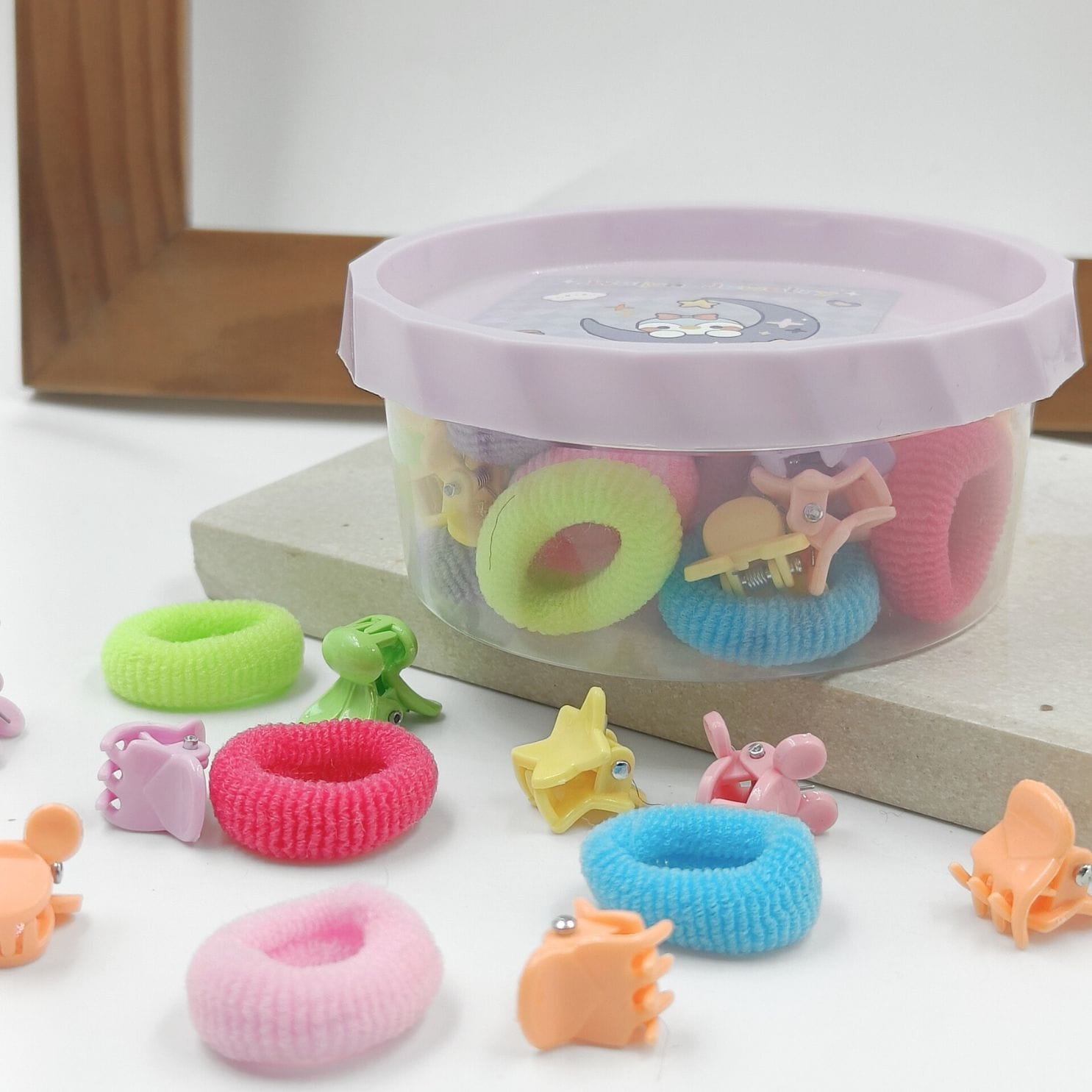 Pamper your kids hair with FHF 40 Piece Cute Mix Design Mini Claw Clips & Rubber band Box.