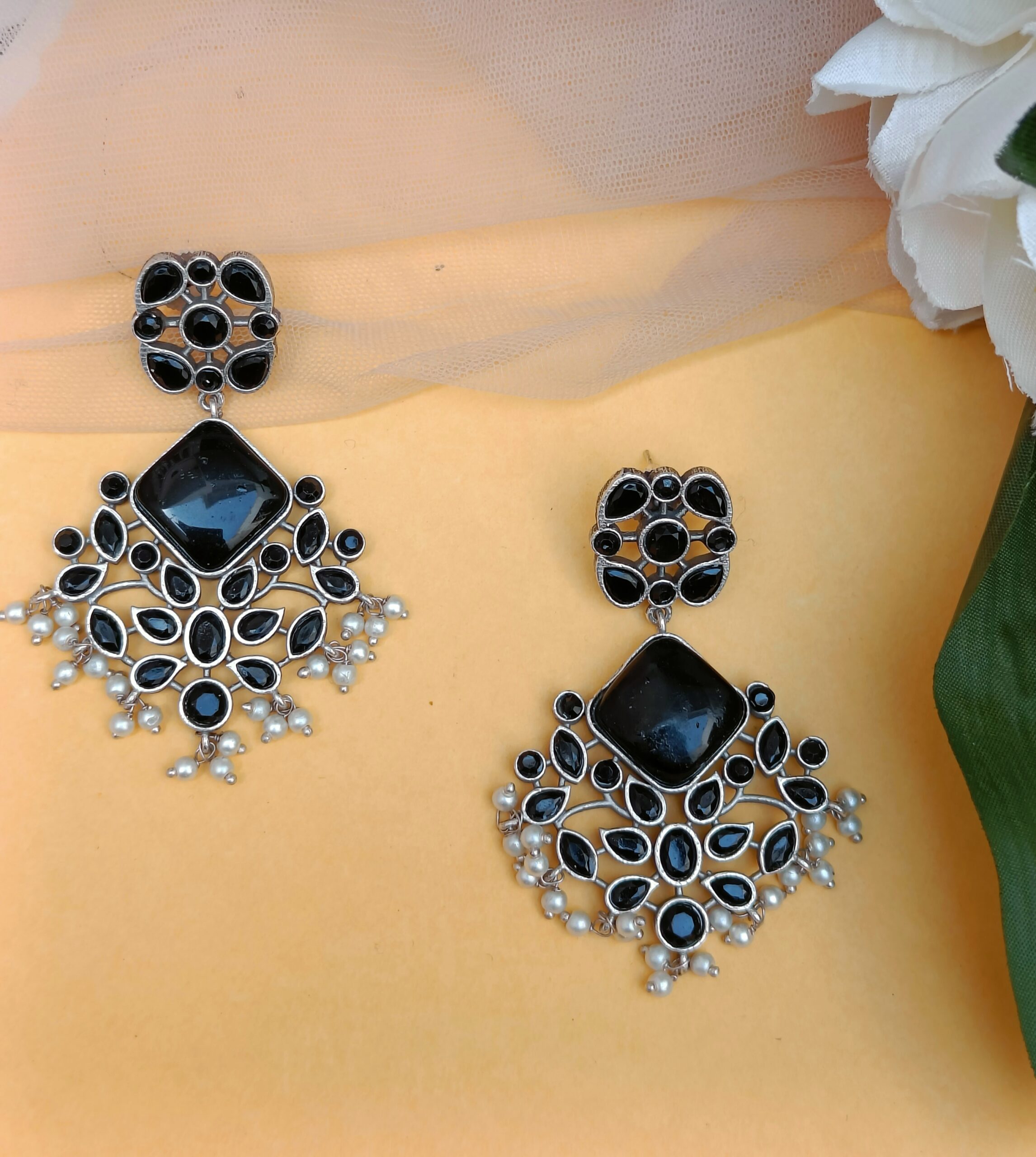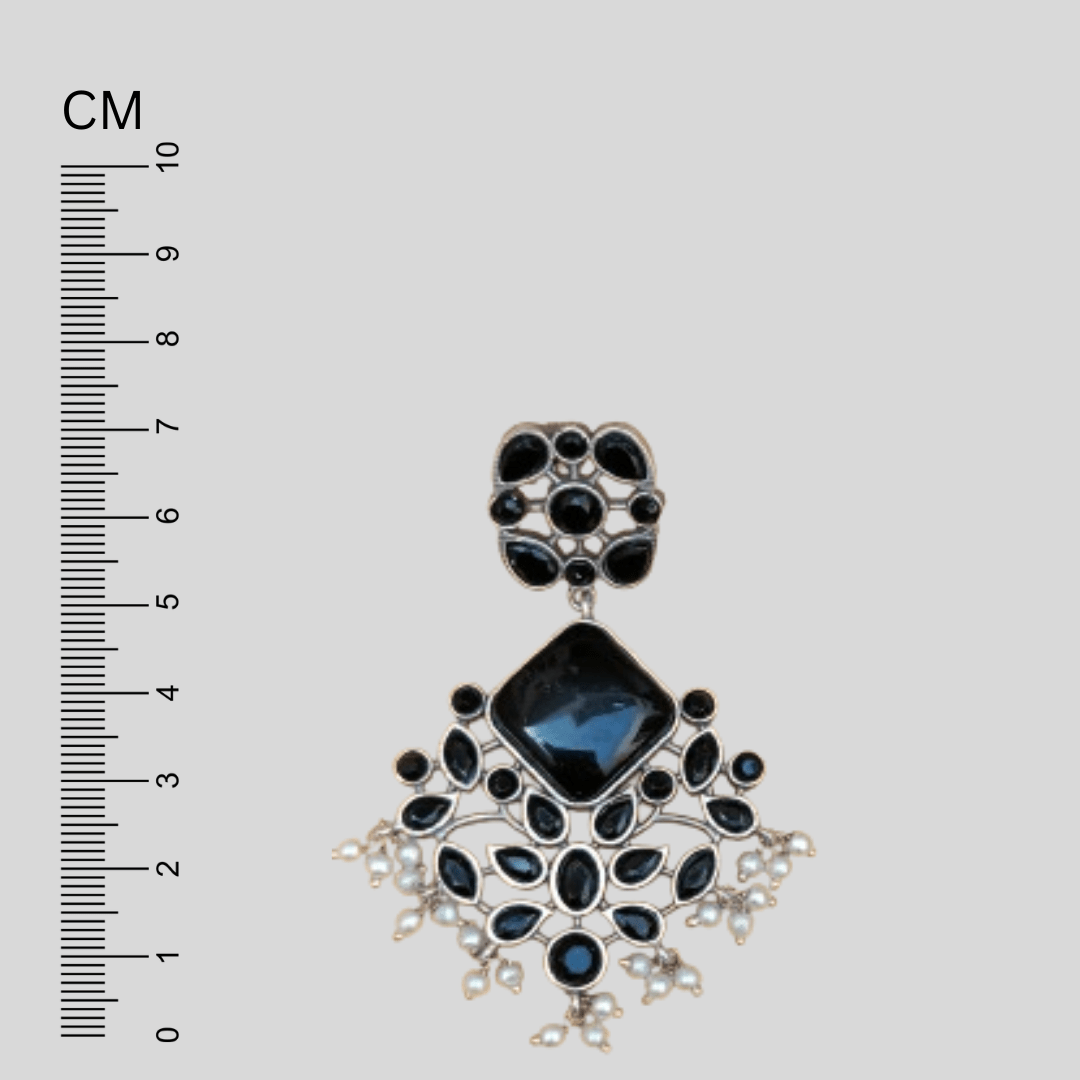 Enhance your style with these exquisite FHF Silver Plated Black Stone Traditional Earrings. Elevate your look with these elegant and captivating statement pieces.