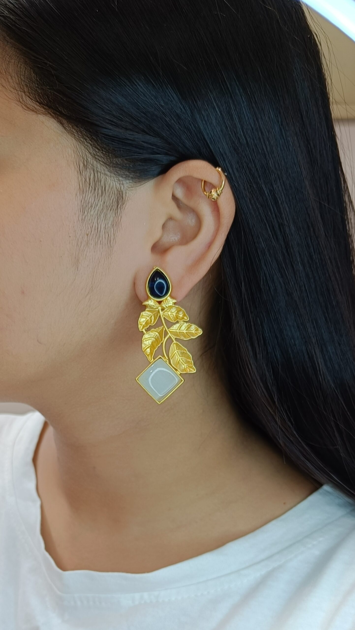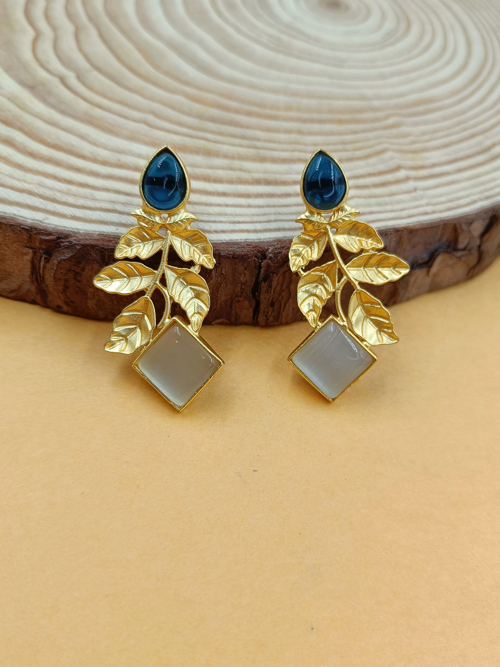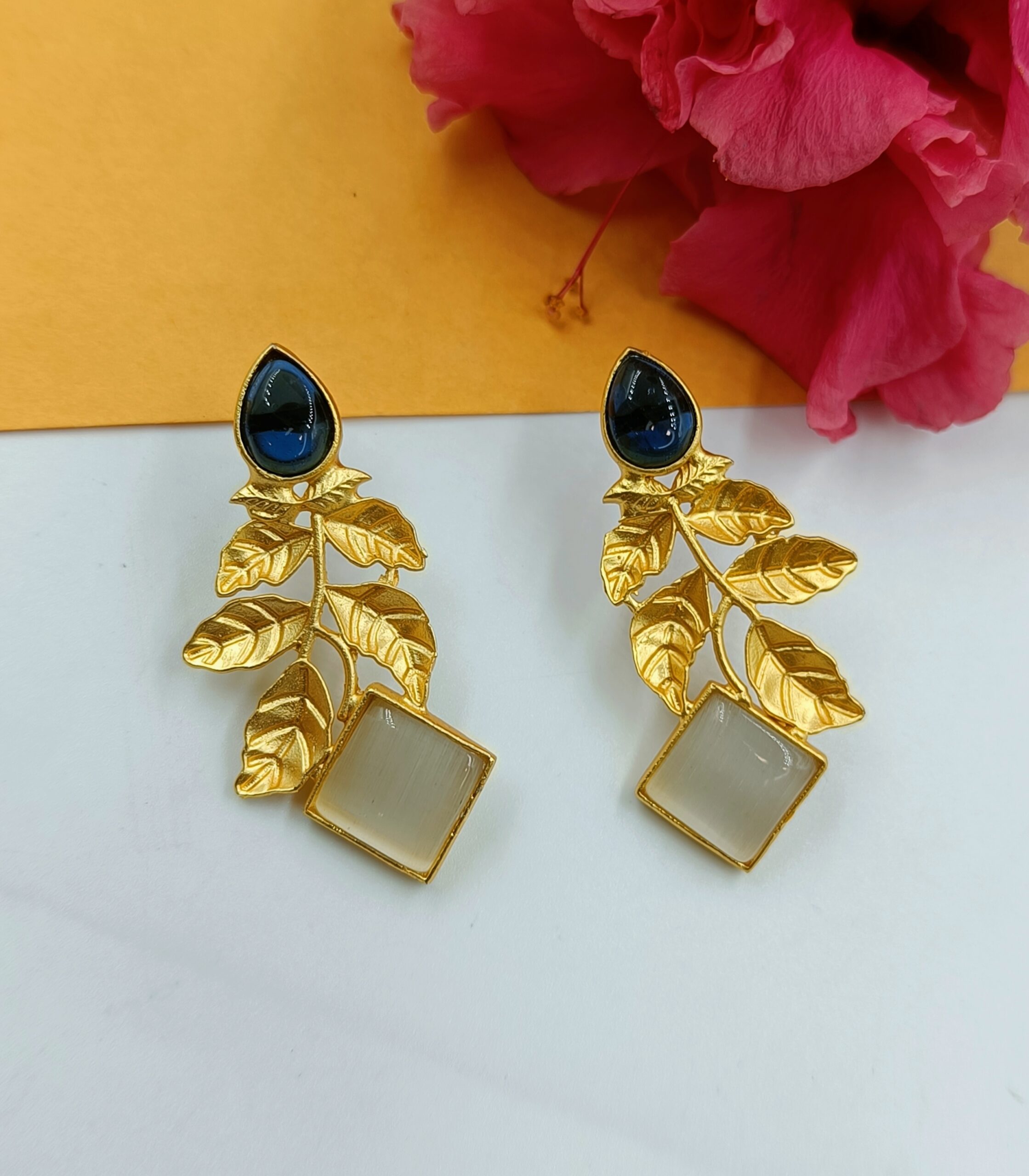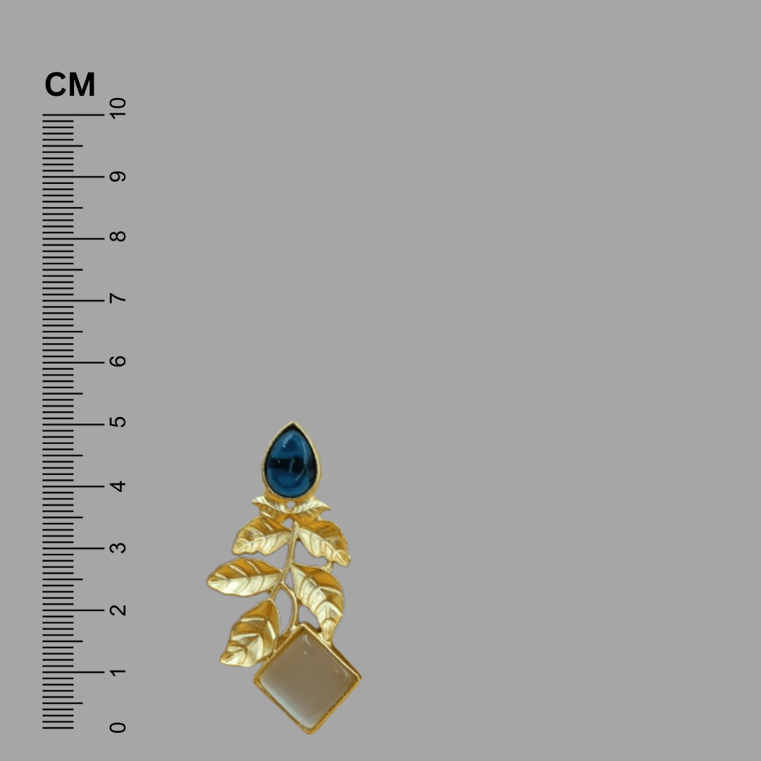FHF Gold Plated Brass Leafy Blue and White Stone Earrings to give elegant look. Bring your style to a whole new level with this handcrafted piece of jewellery.