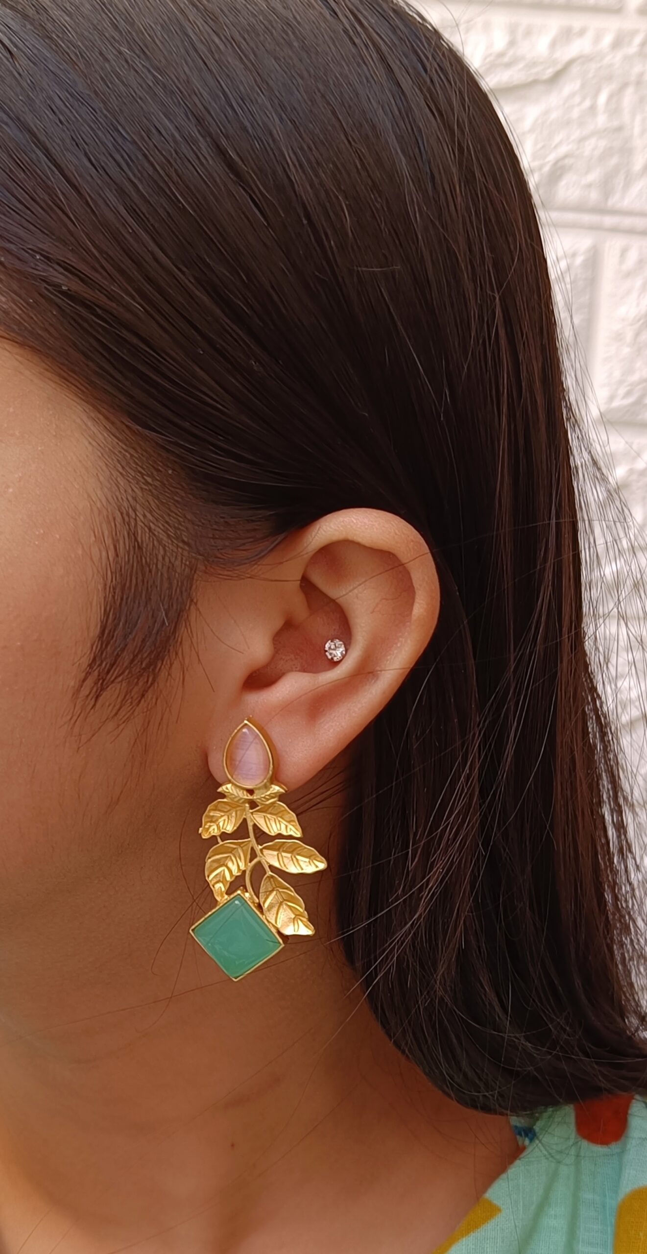 Gold Plated Brass Leafy Pink and Green Stone Earrings to give elegant look. Bring your style to a whole new level with this handcrafted piece of jewellery.