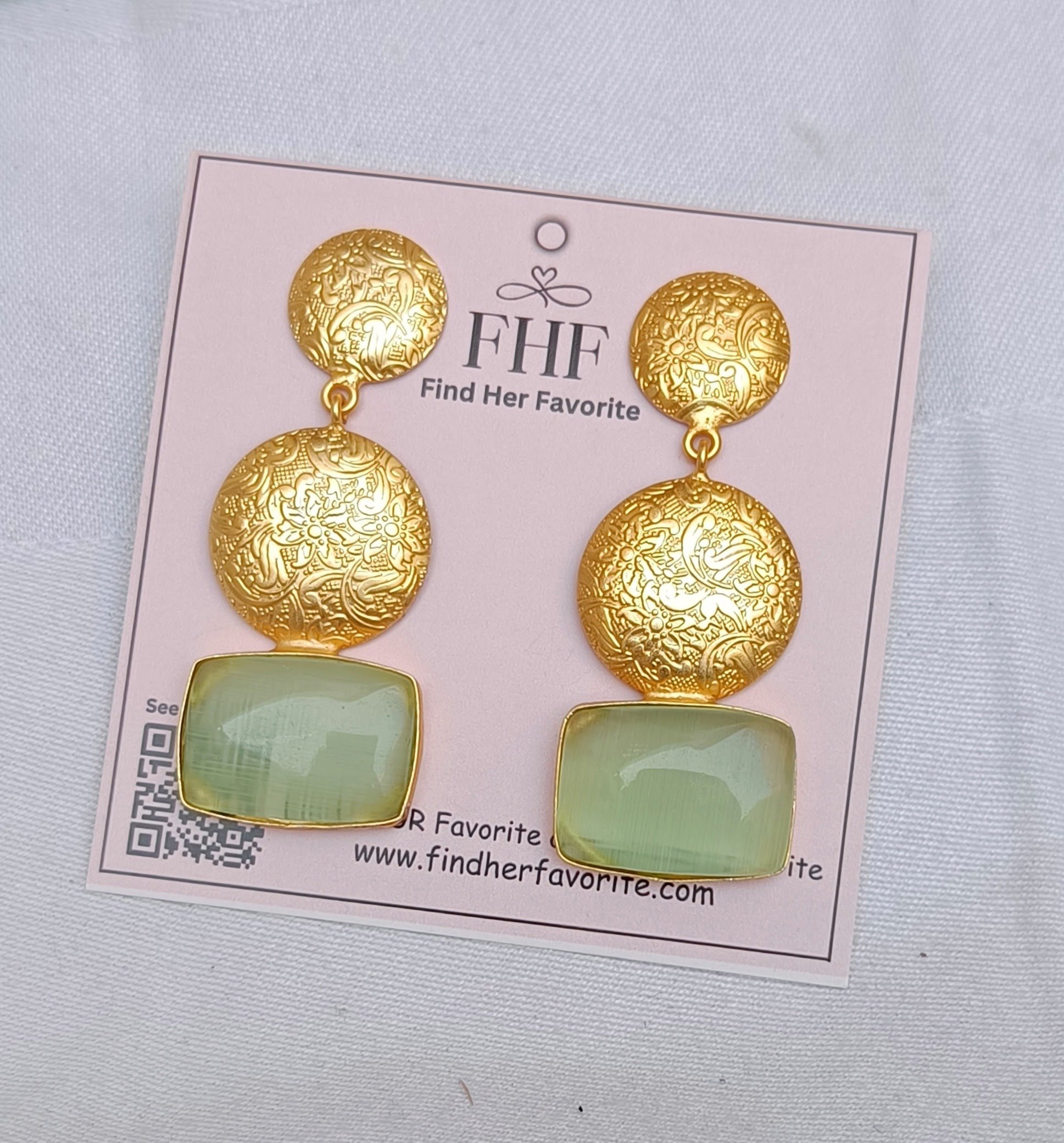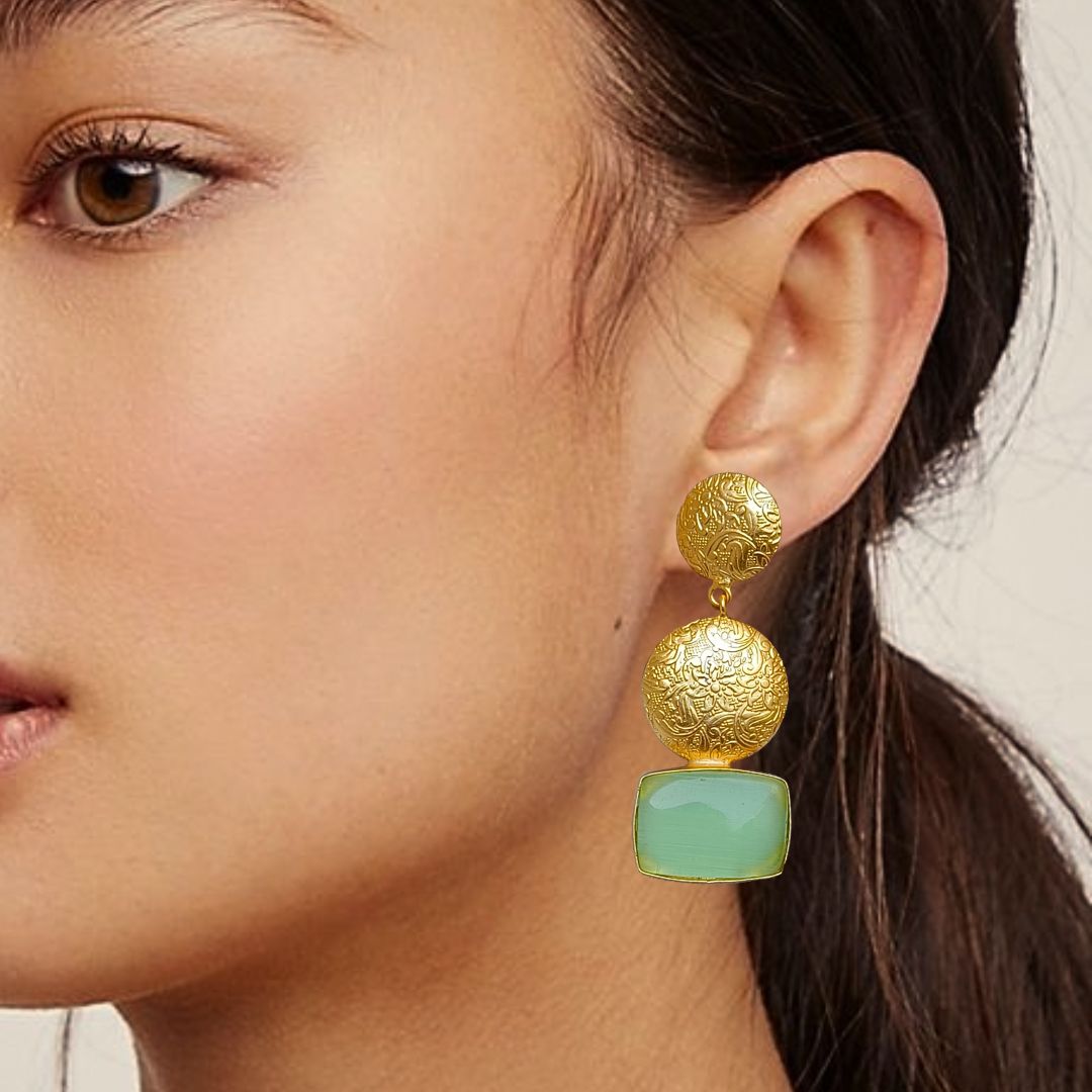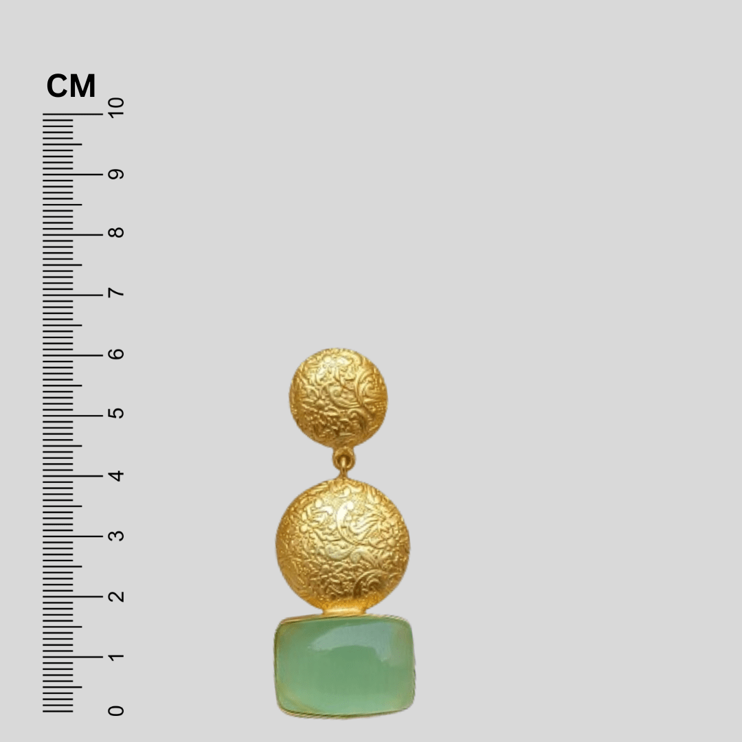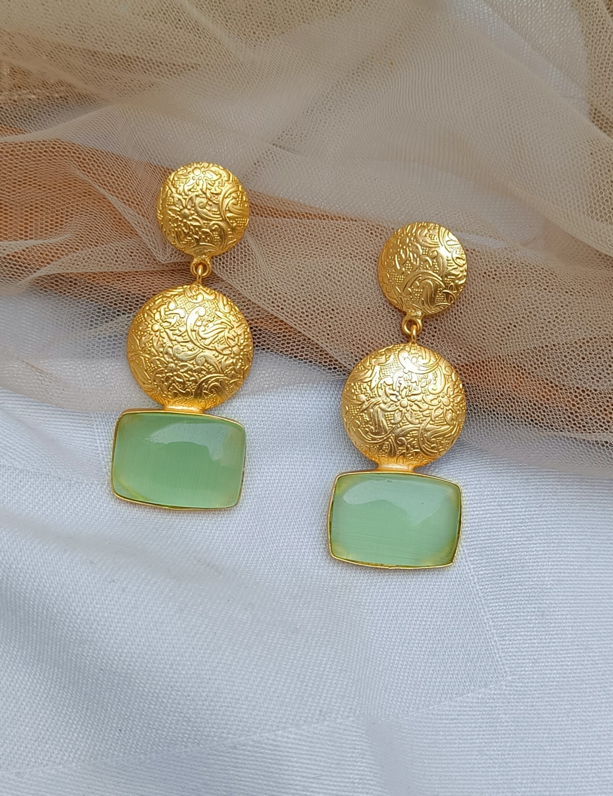 Enhance your style with these exquisite Gold Plated Designer Mint Green Natural Stone Dangler Earrings. Elevate your look with these elegant and captivating statement pieces.