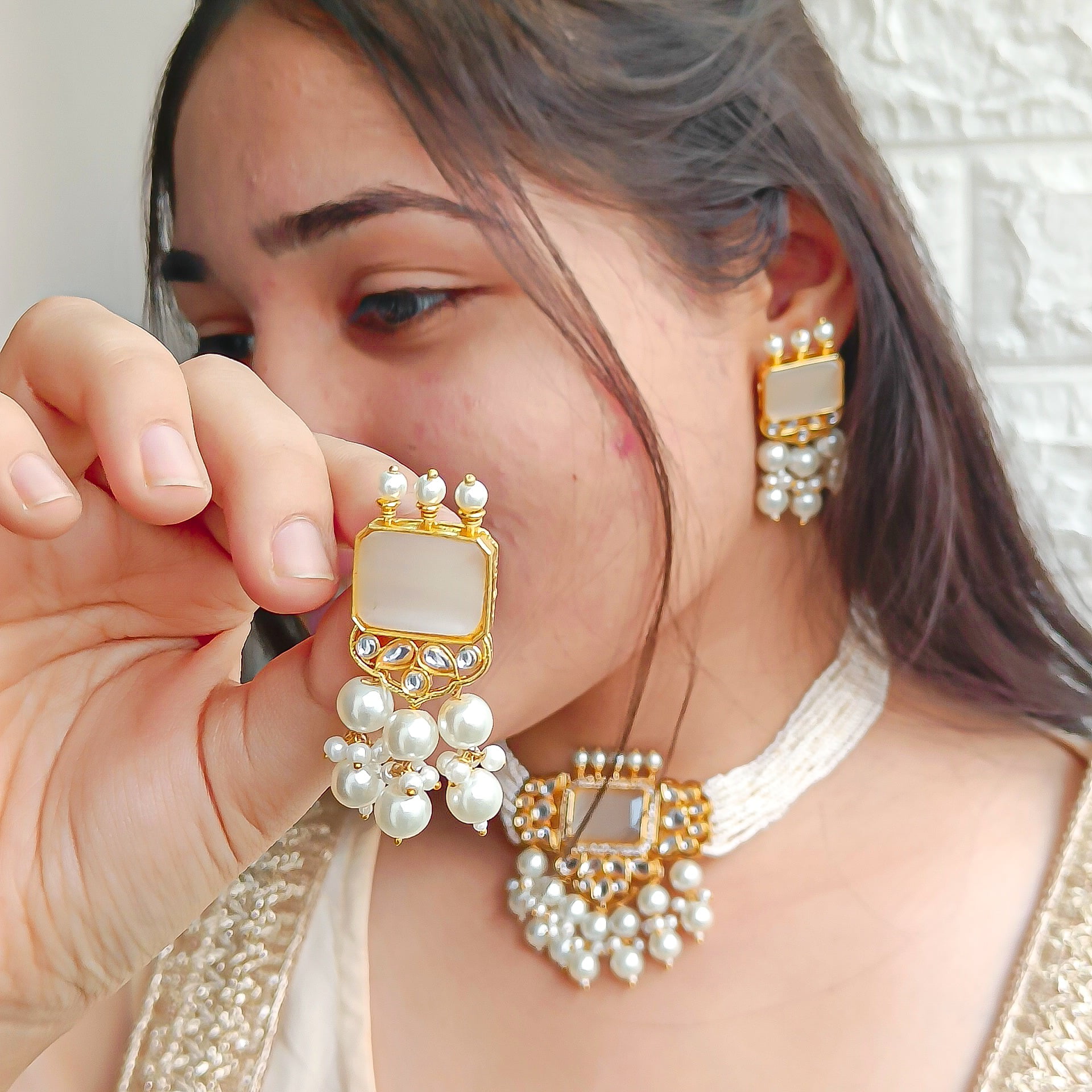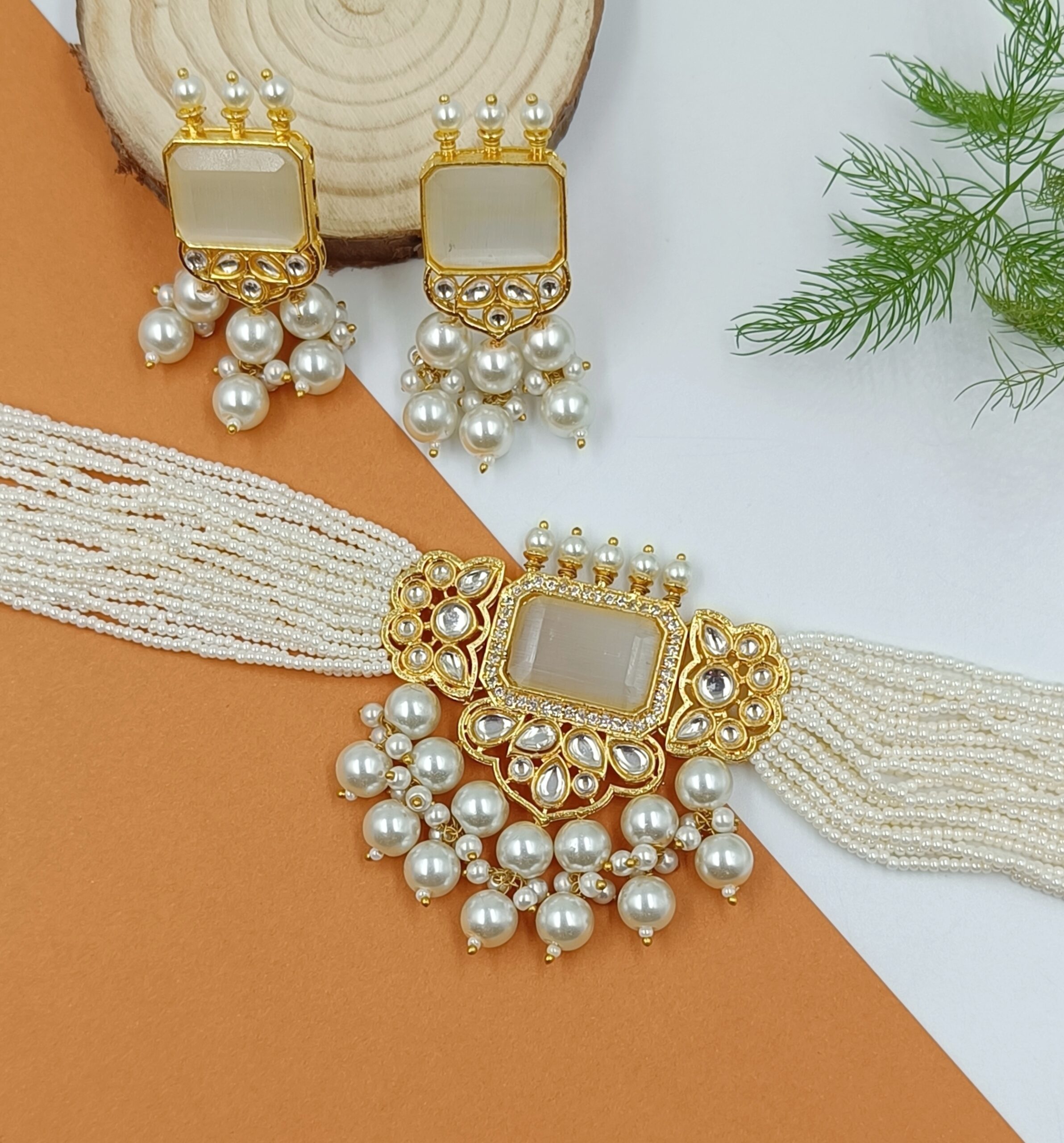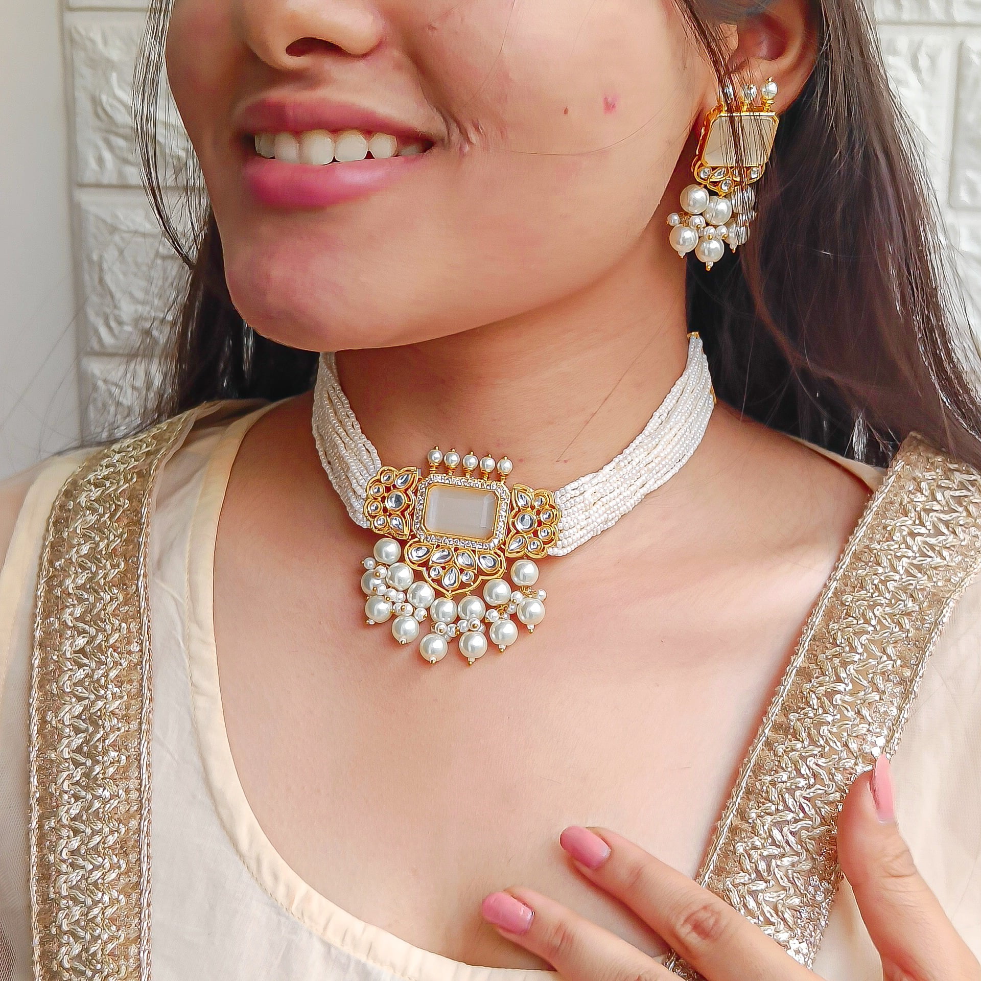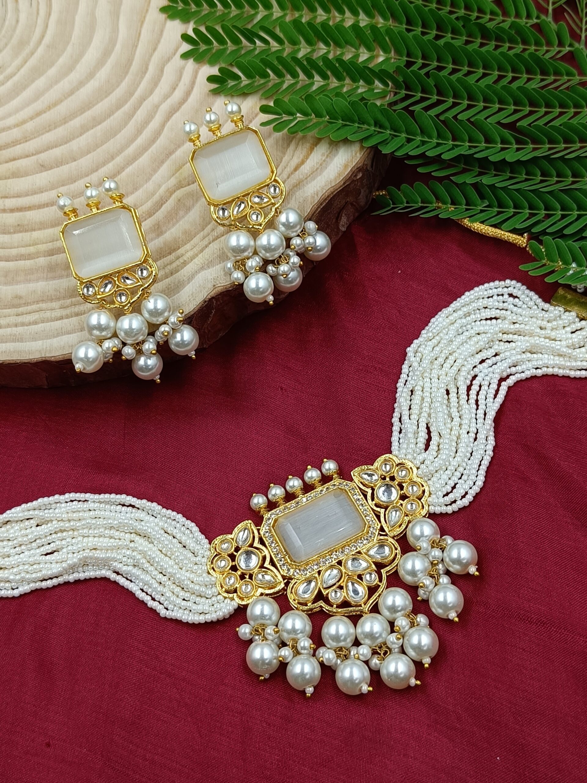 Designer White stone choker set with beads and pearl work. Exude the royal vibe with this stone studded jewellery set. Consisting of a necklace and matching earrings.