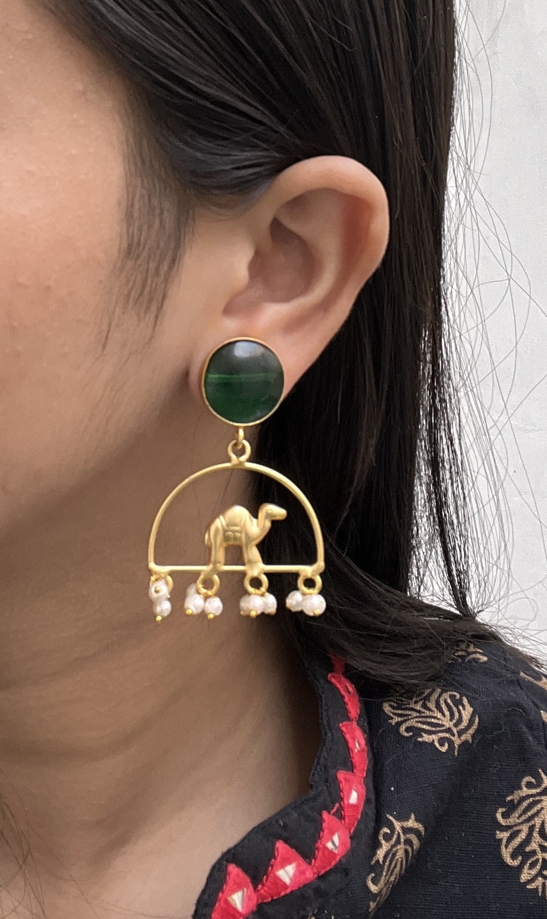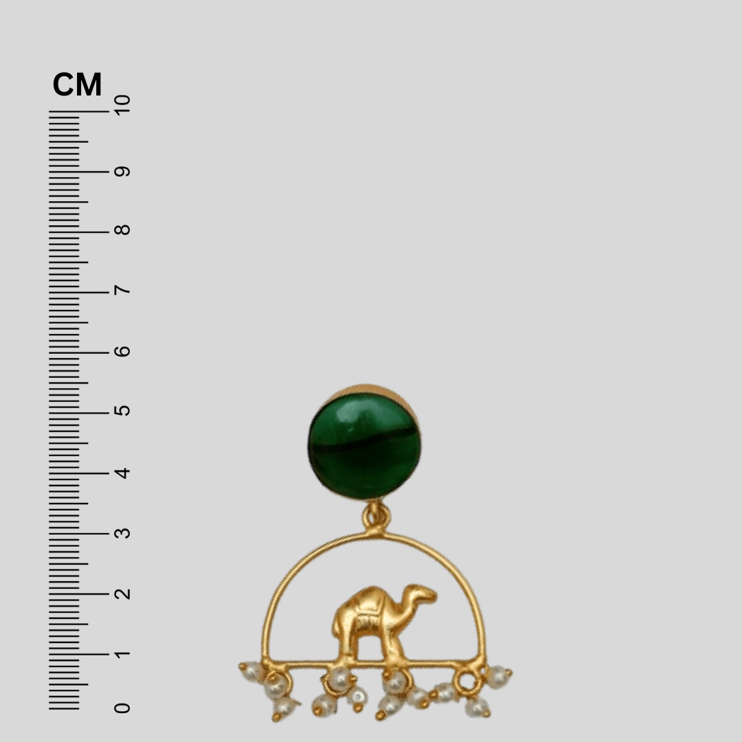 Enhance your style with these exquisite Gold Plated Green Stone Camel Design Earrings . Elevate your look with these elegant and captivating statement pieces.