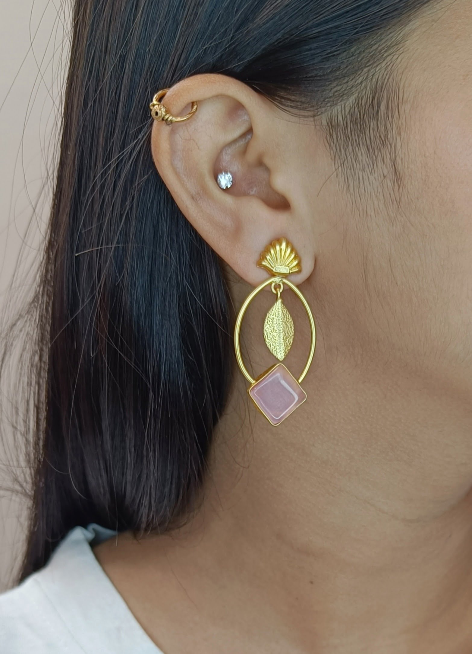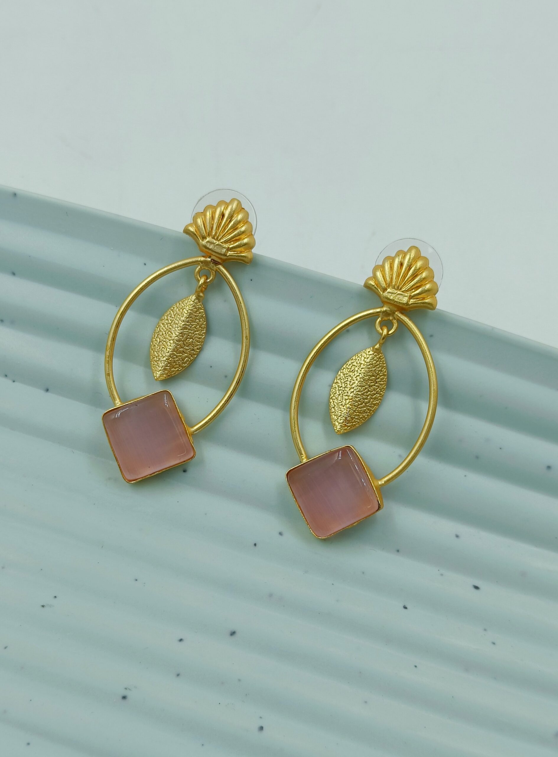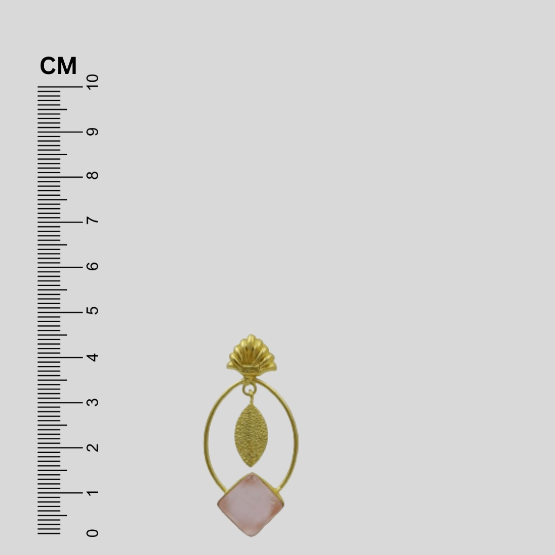Embrace your look with Gold Plated Pink Stone Studded Designer Brass Leaf Dangler Earrings with leaf pattern. The earrings are having matte finish giving elegant look.