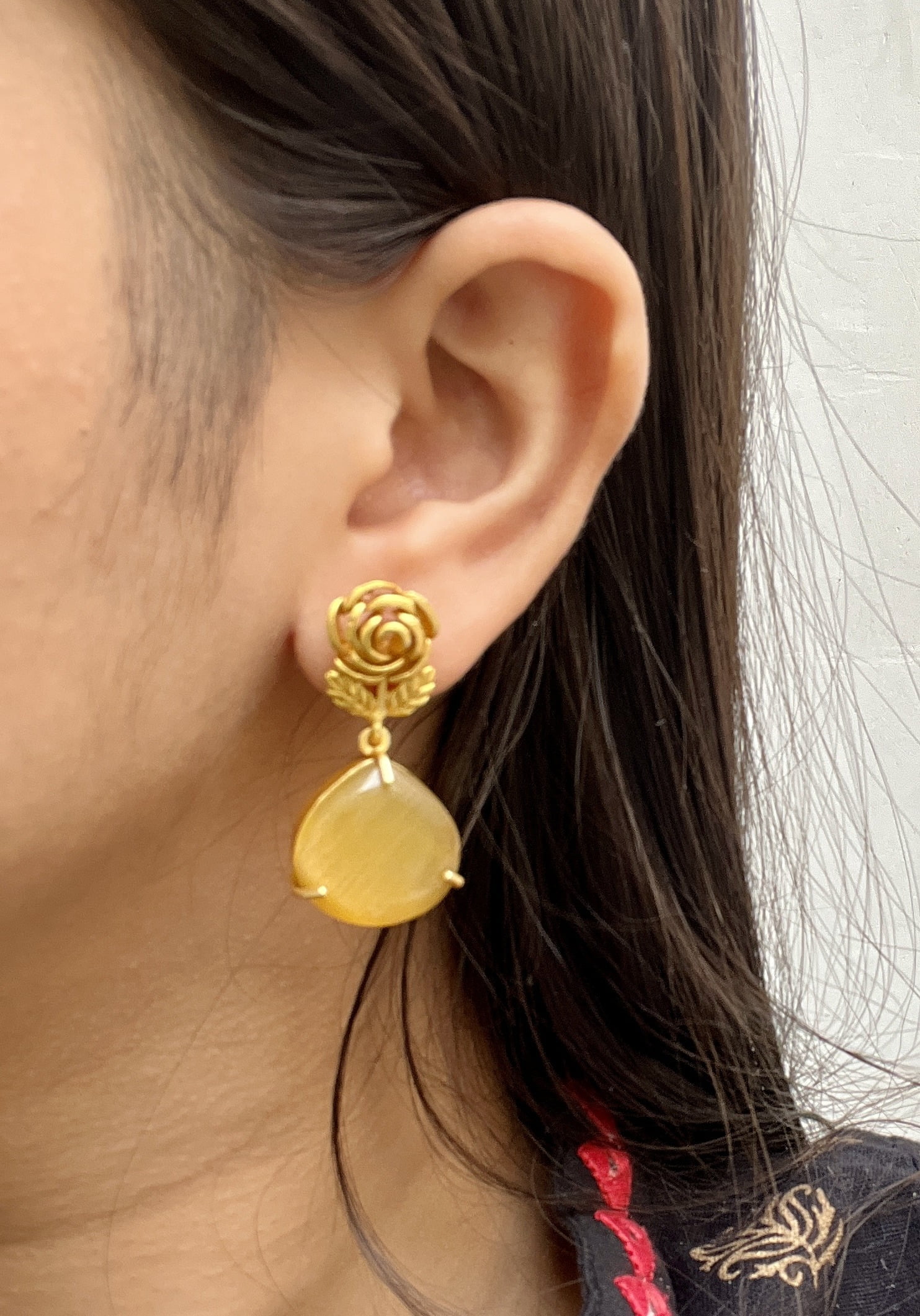 Enhance your style with these exquisite Gold Plated Rose Yellow Stone Drop Earrings. Elevate your look with these elegant and captivating statement pieces.