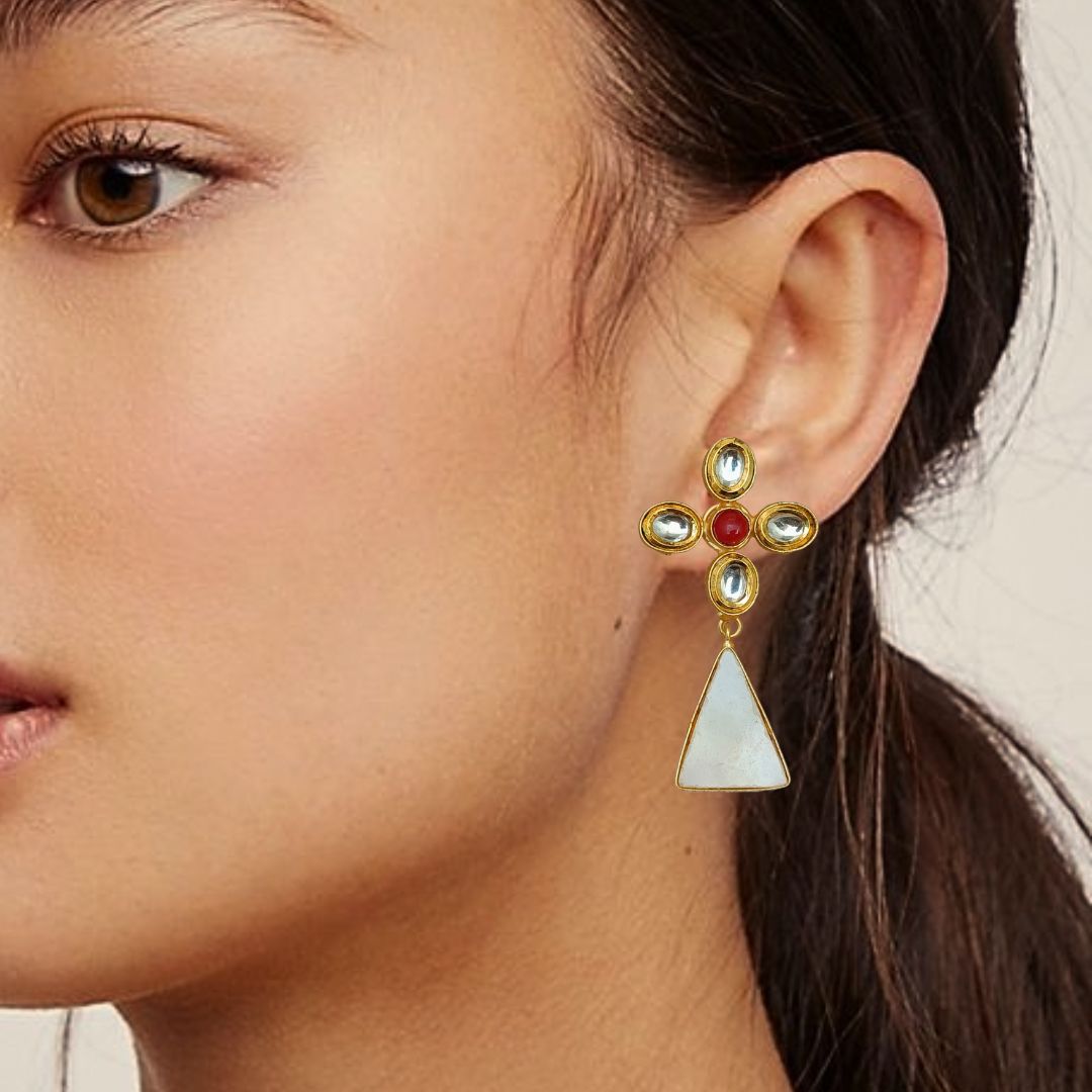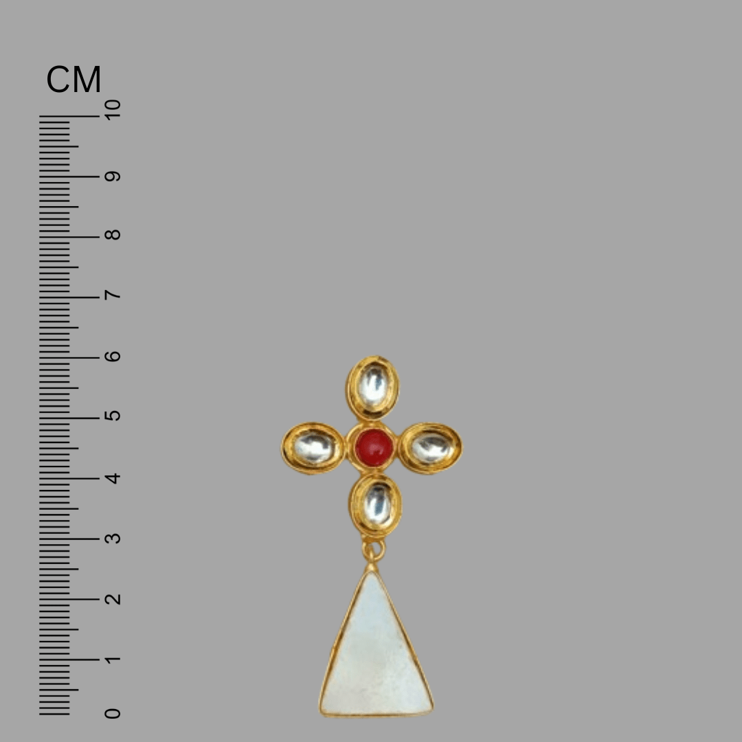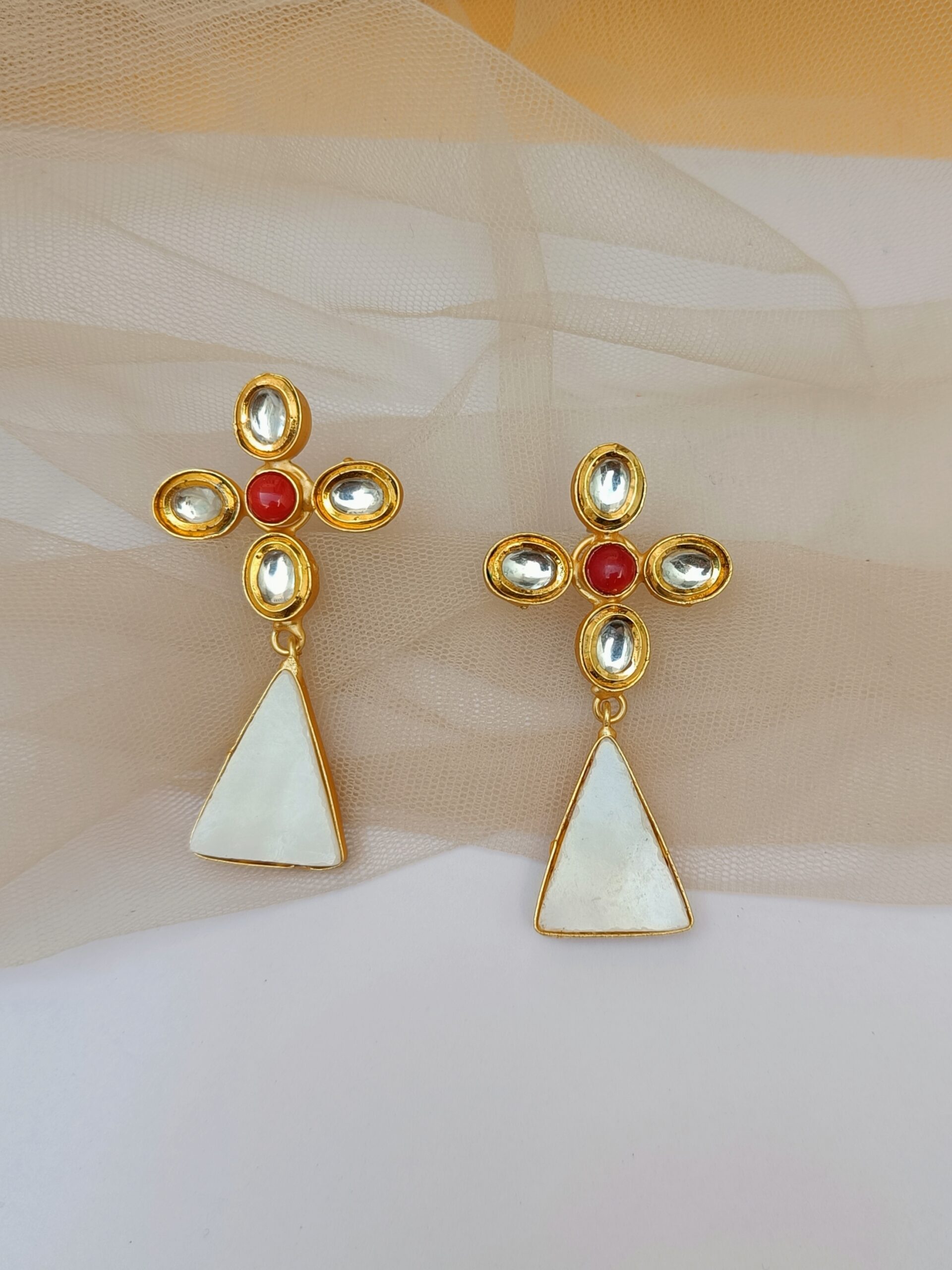 Enhance your style with these exquisite Gold Plated Stone Triangular Kundan Earrings. Elevate your look with these elegant and captivating statement pieces.