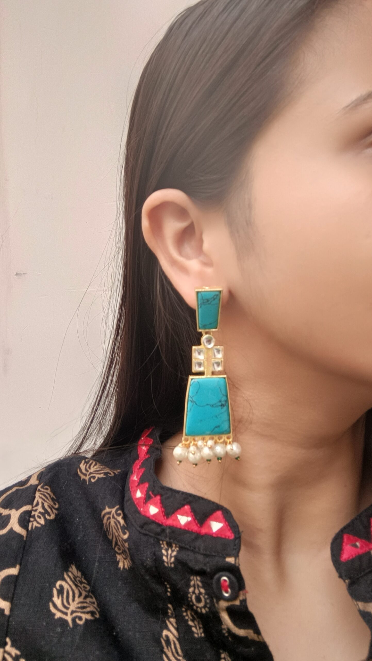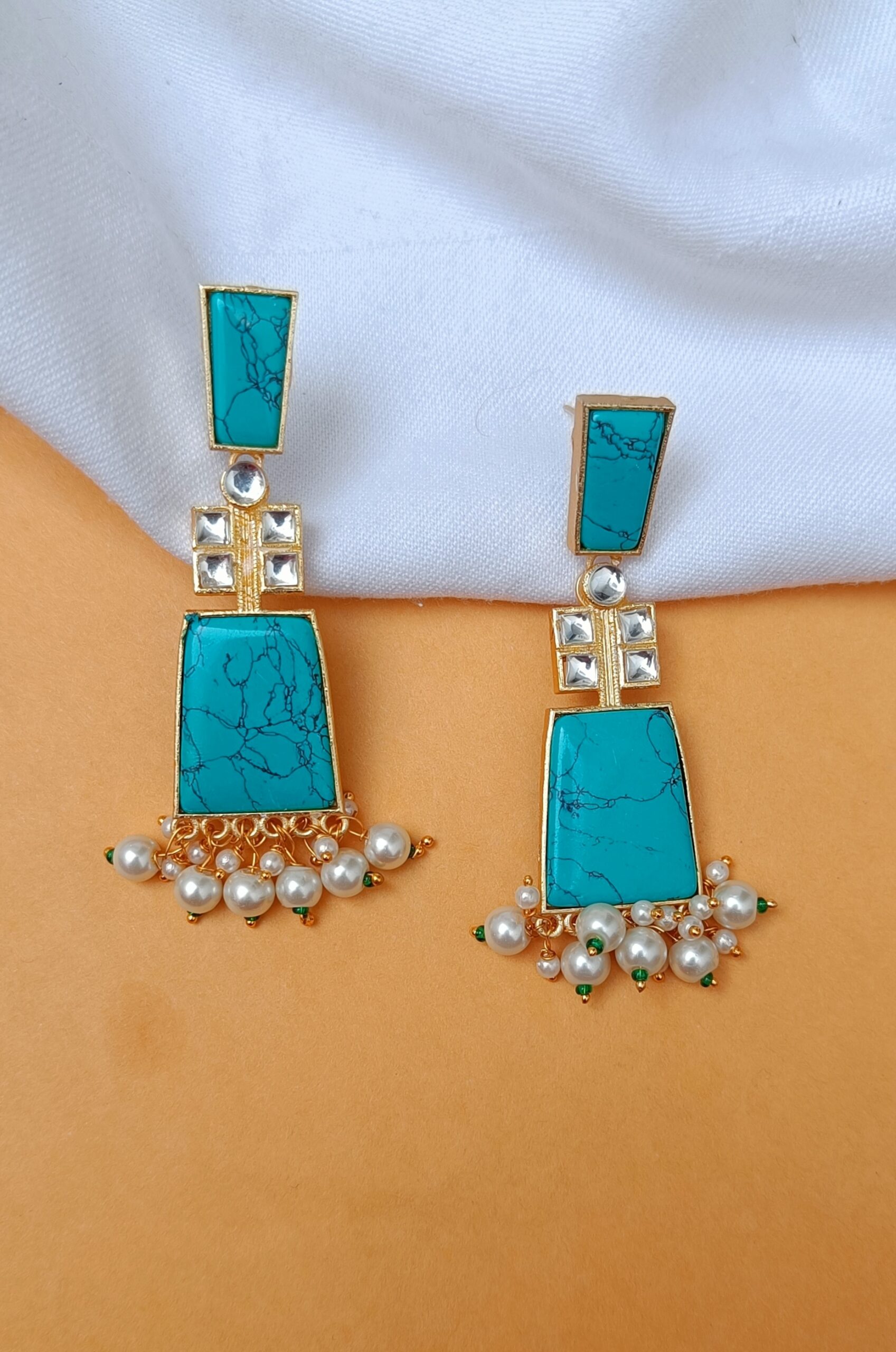 Enhance your style with these exquisite Gold Plated Turquoise Stone Designer Dangler Earrings. Elevate your look with these elegant and captivating statement pieces.