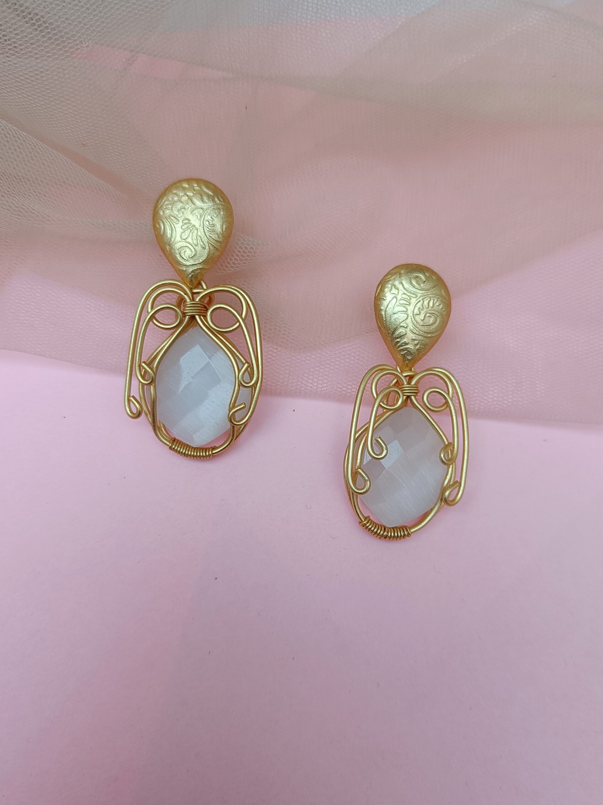 Enhance your style with these exquisite Gold Plated White Stone Designer Drop Earrings. Elevate your look with these elegant and captivating statement pieces.