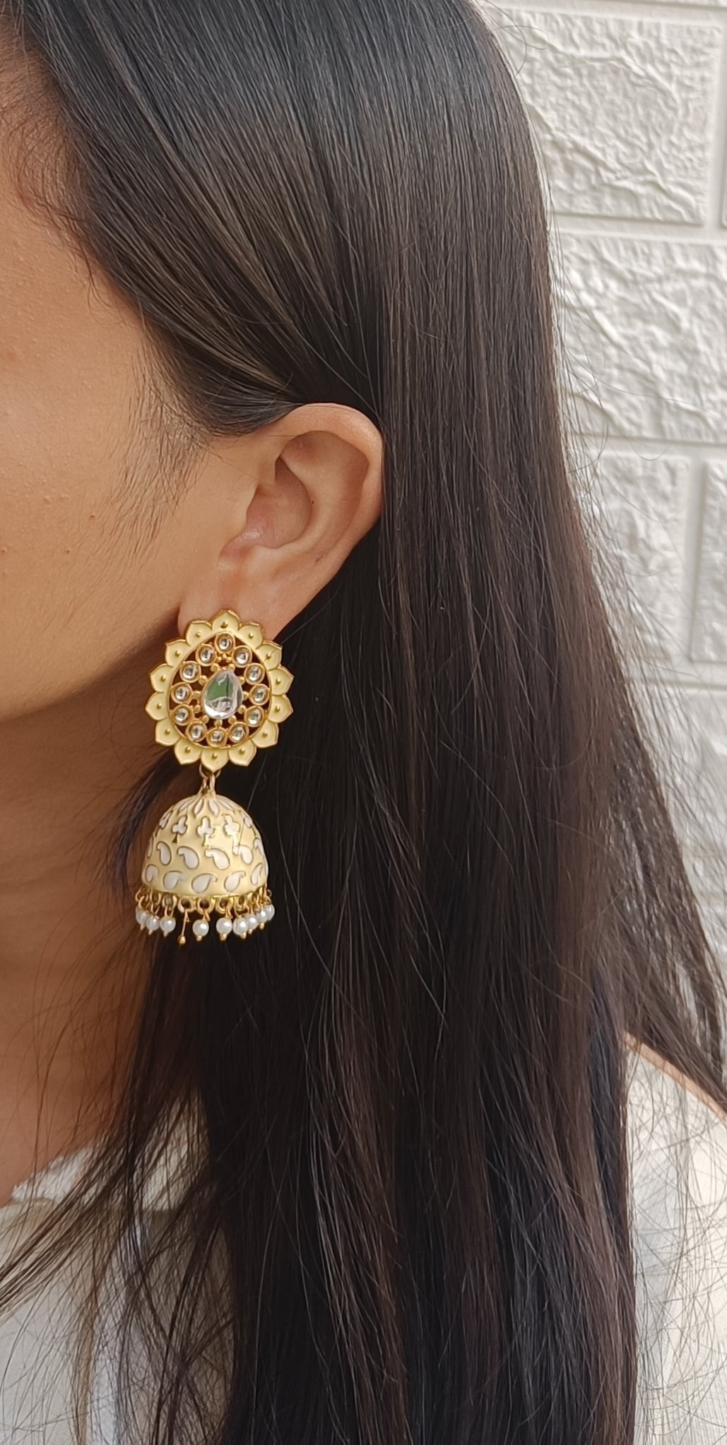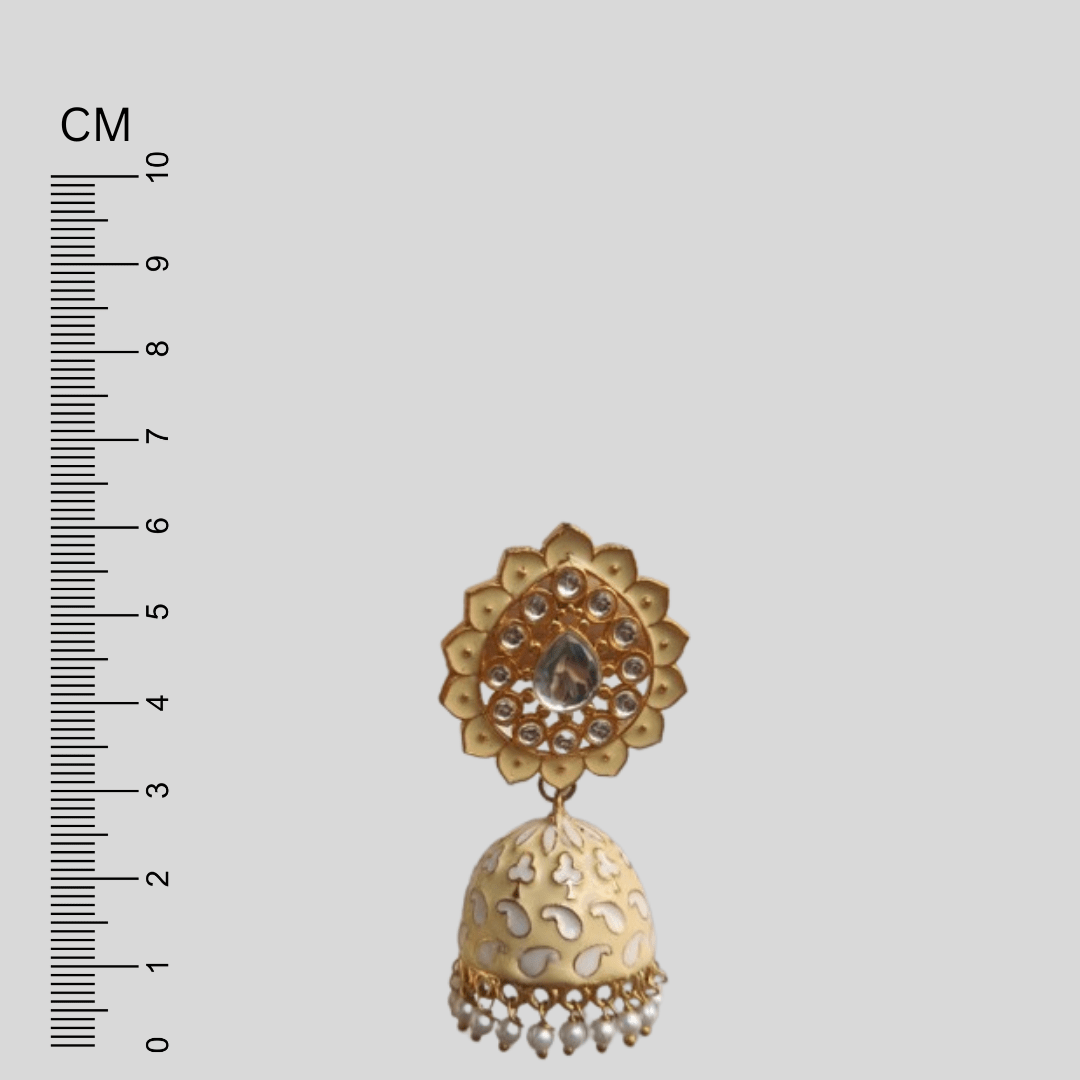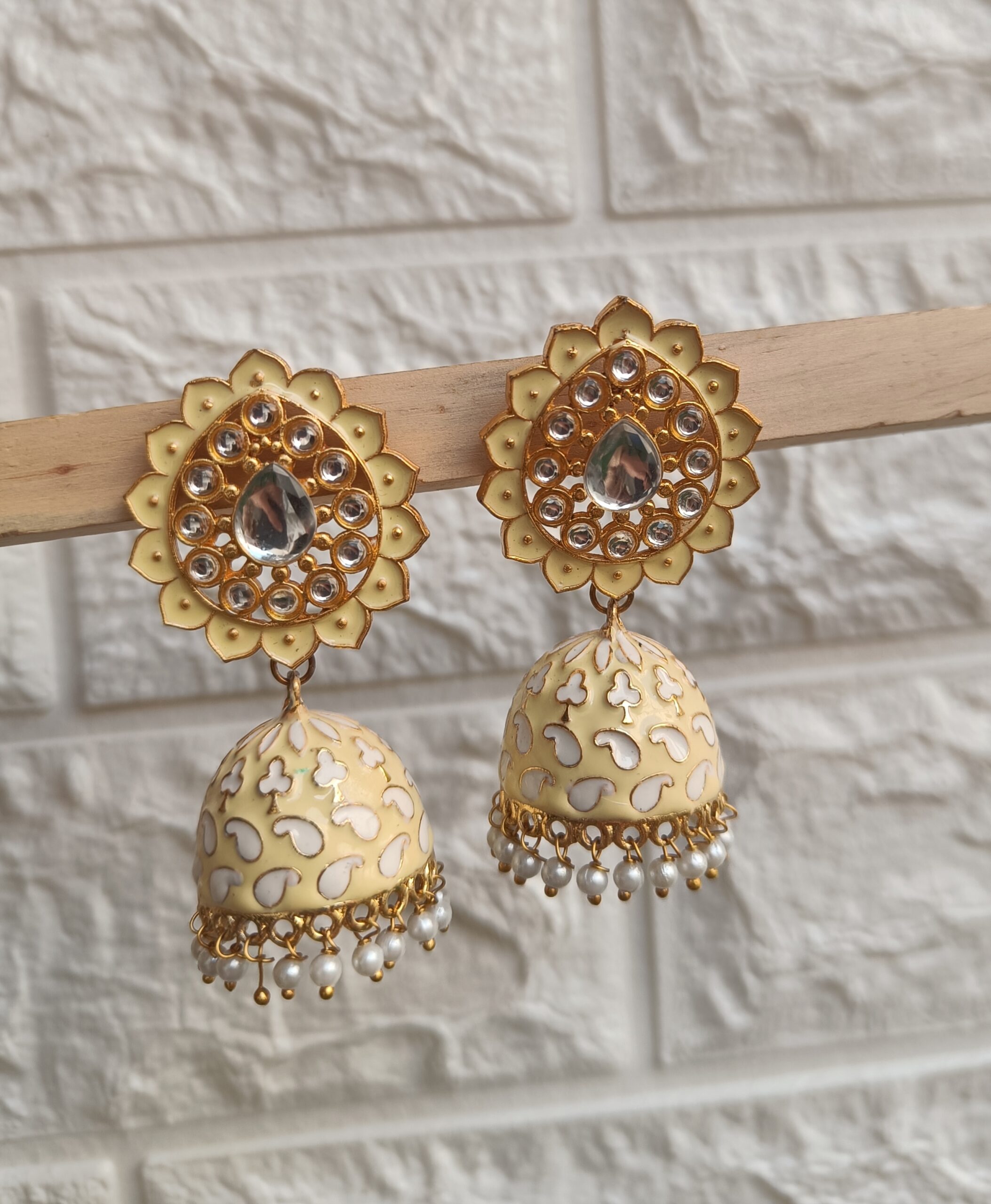 Elevate your look with Gold Plated Yellow Meenakari Stone Jhumka Earrings .These are elegant and captivating statement pieces that will enhance your beauty.