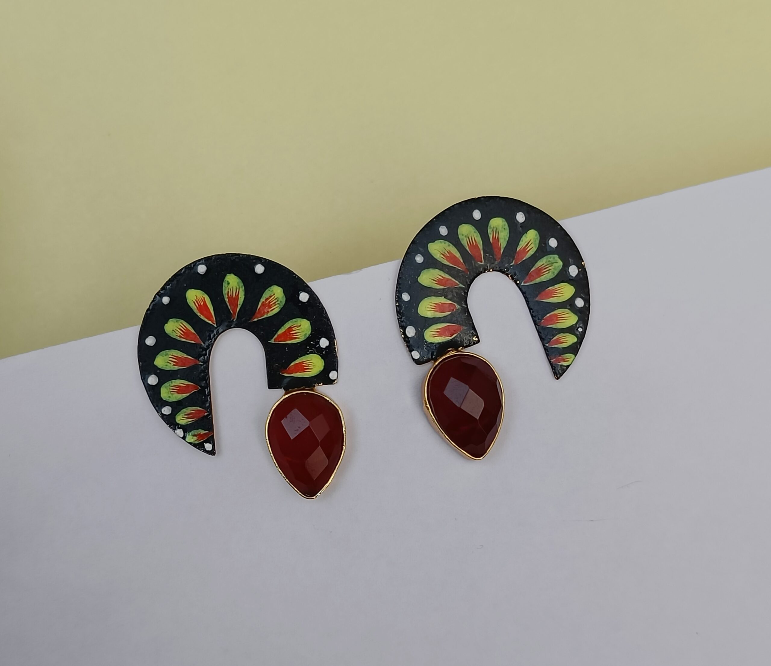 Enhance your style with these exquisite Hand-Painted Drop Stone Studded Designer Earrings. Elevate your look with these elegant and captivating statement pieces.