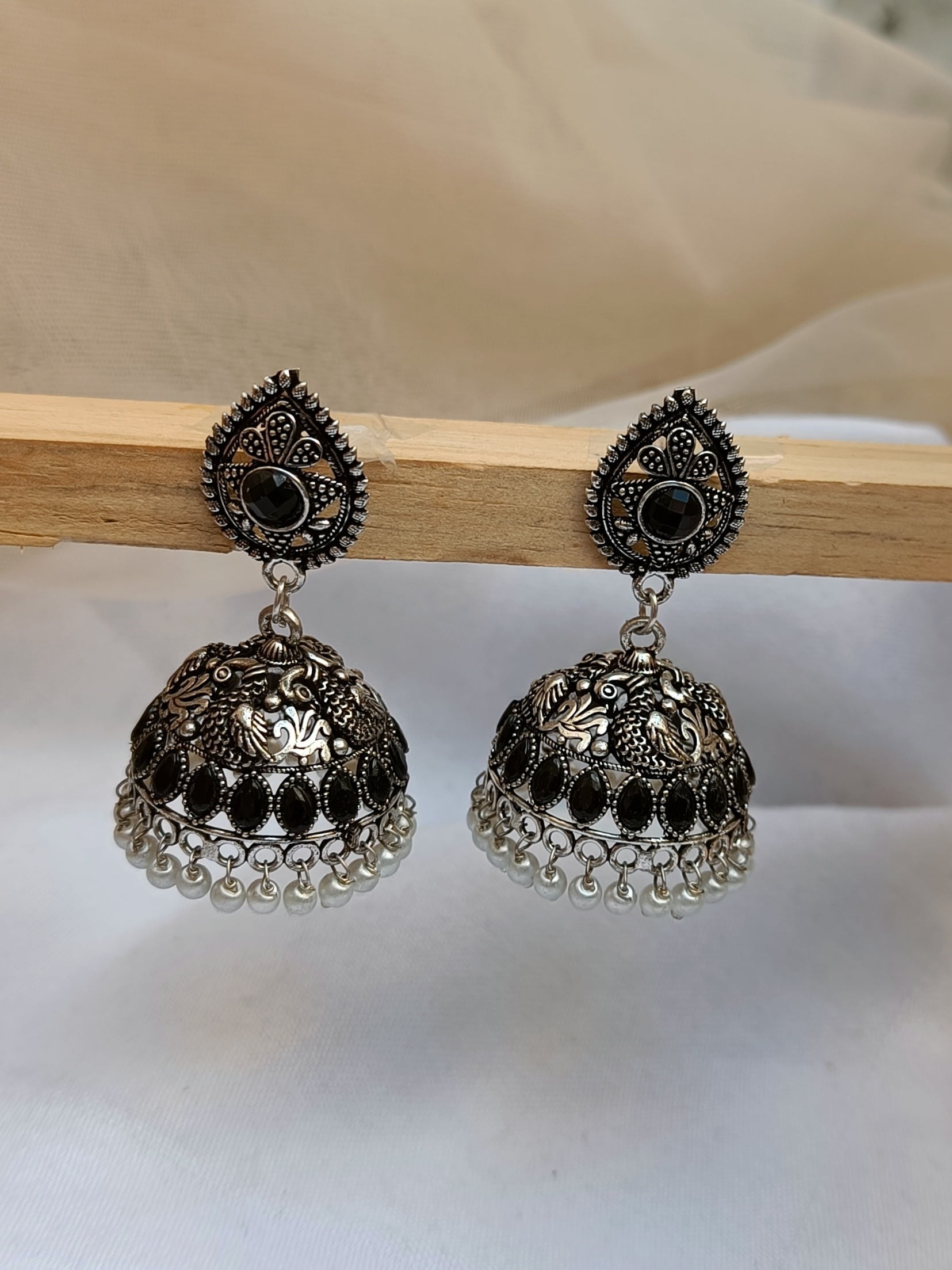 Elevate your look with Oxidised Black Stone Jhumka Earrings These are elegant and captivating statement pieces that will enhance your beauty.