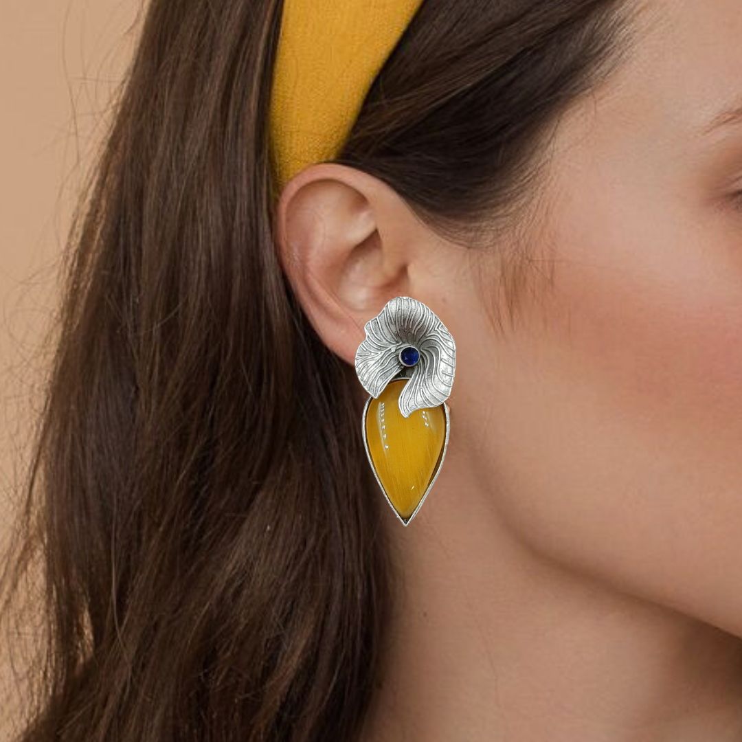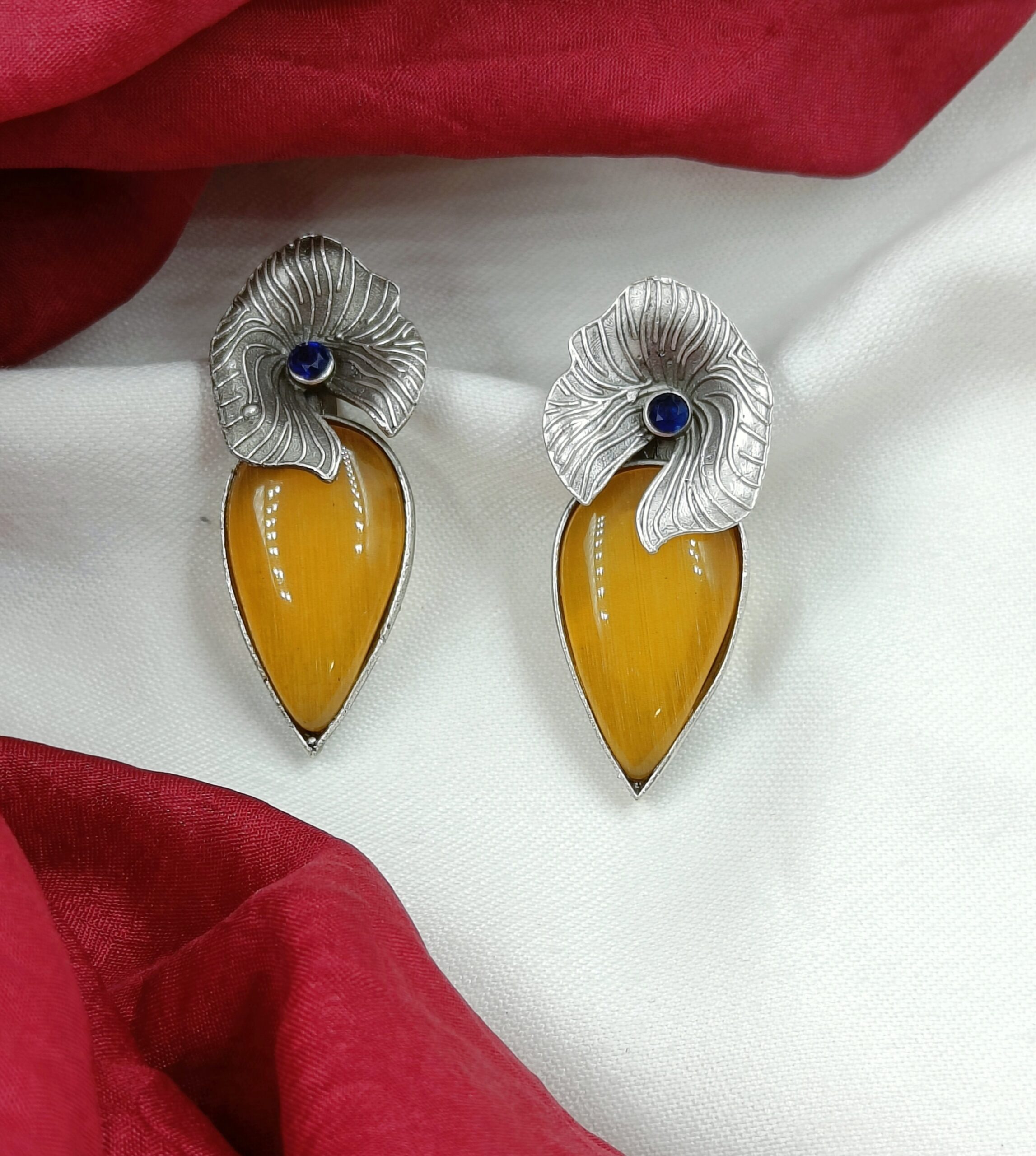 Elevate your look with FHF Silver Plated Brass Flower Shaped Natural Stone Dangler Earrings. These are elegant and captivating statement pieces that will enhance your beauty.