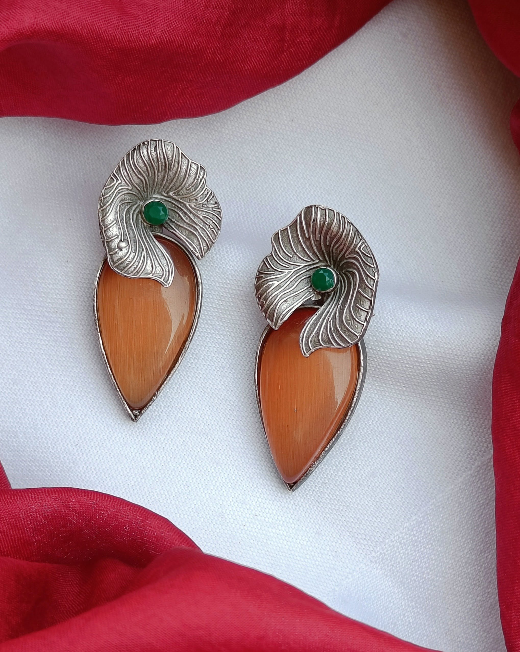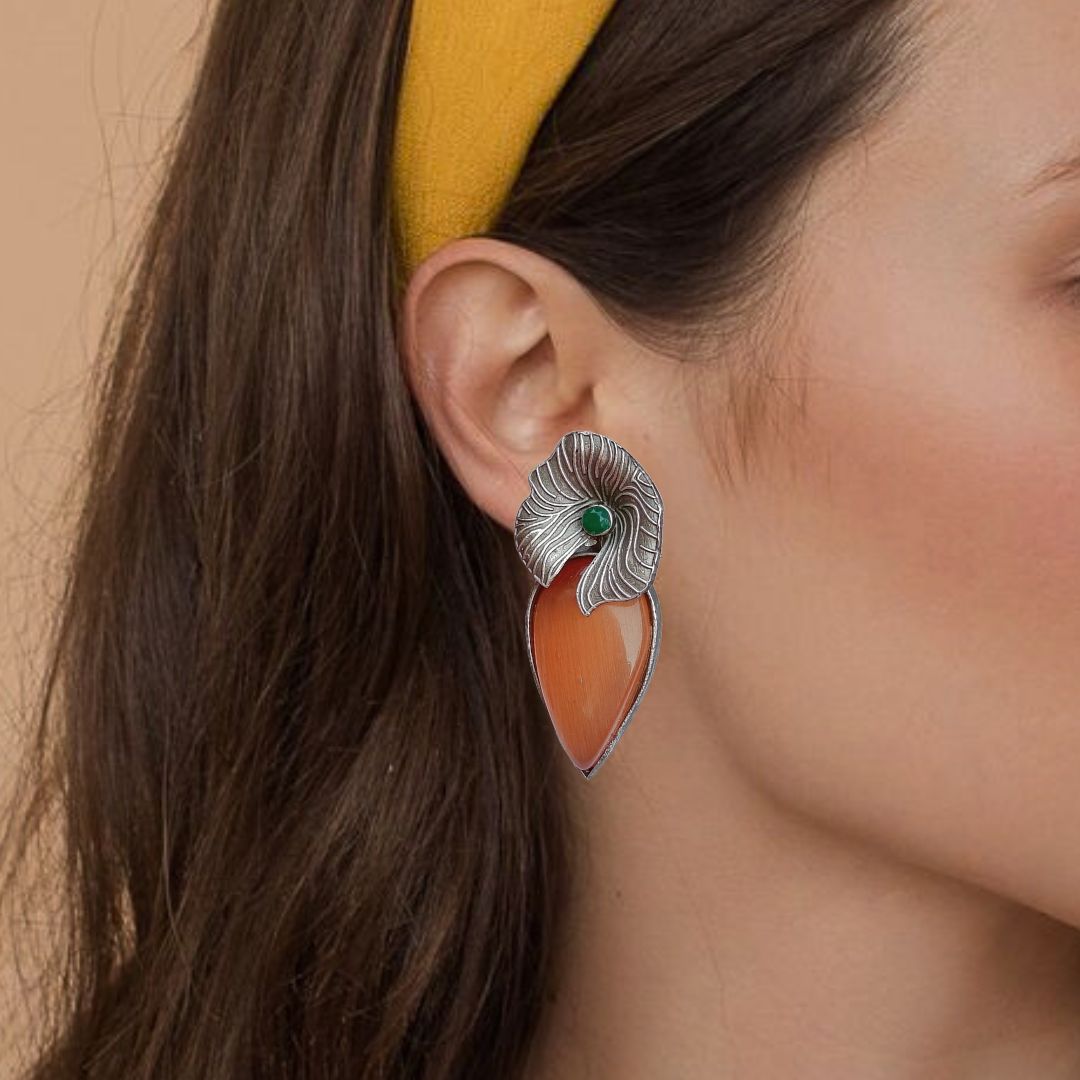 Elevate your look with FHF Silver Plated Brass Flower Shaped Natural Stone Dangler Earrings. These are elegant and captivating statement pieces that will enhance your beauty.