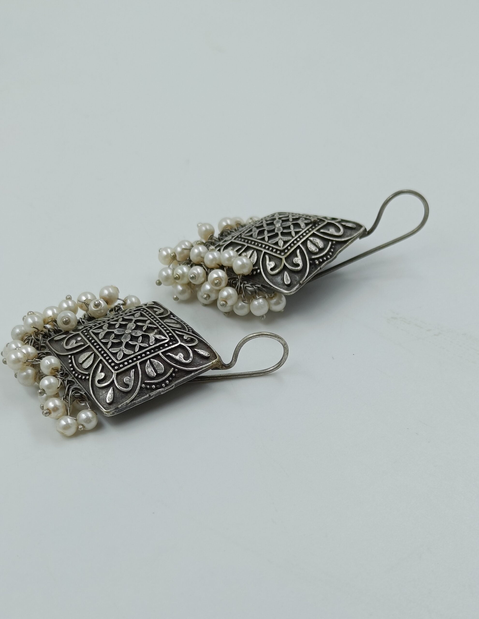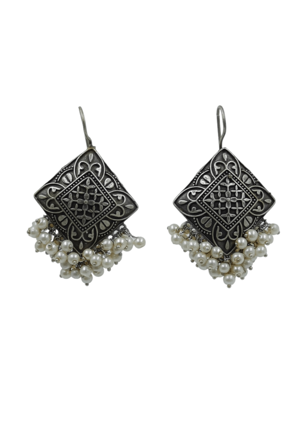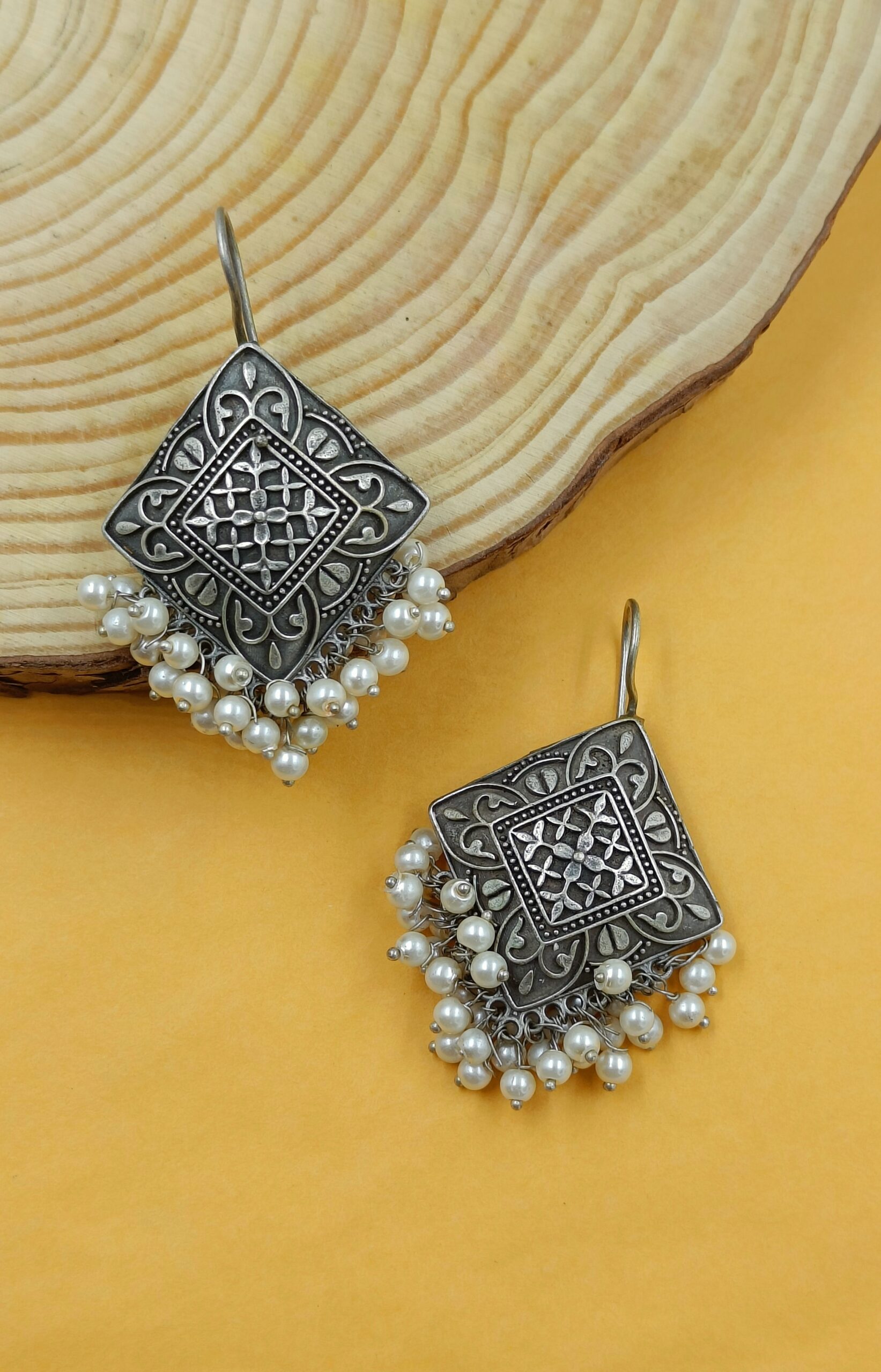 Oomph your look with FHF Silver Plated Brass Square Shaped Beaded Hook Earrings. Bring your style to a whole new level with this handcrafted piece of jewellery.